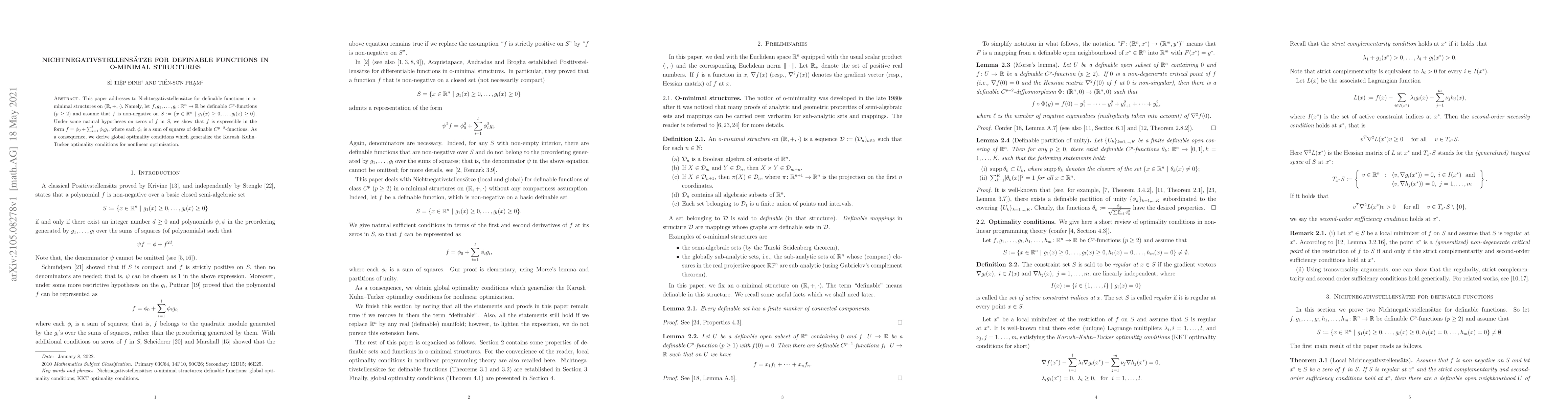 This paper addresses to Nichtnegativstellens\"atze for definable functions in o-minimal structures on $(\mathbb{R}, +, \cdot).$ Namely, let $f, g_1, \ldots, g_l \colon \mathbb{R}^n \to \mathbb{R}$ be definable $C^p$-functions ($p \ge 2$) and assume that $f$ is non-negative on $S := \{x \in \mathbb{R}^n \ | \ g_1(x) \ge 0, \ldots, g_l(x) \ge 0 \}.$ Under some natural hypotheses on zeros of $f$ in $S,$ we show that $f$ is expressible in the form $f = \phi_0 + \sum_{i = 1}^l \phi_i g_i,$ where each $\phi_i$ is a sum of squares of definable $C^{p - 2}$-functions. As a consequence, we derive global optimality conditions which generalize the Karush--Kuhn--Tucker optimality conditions for nonlinear optimization.