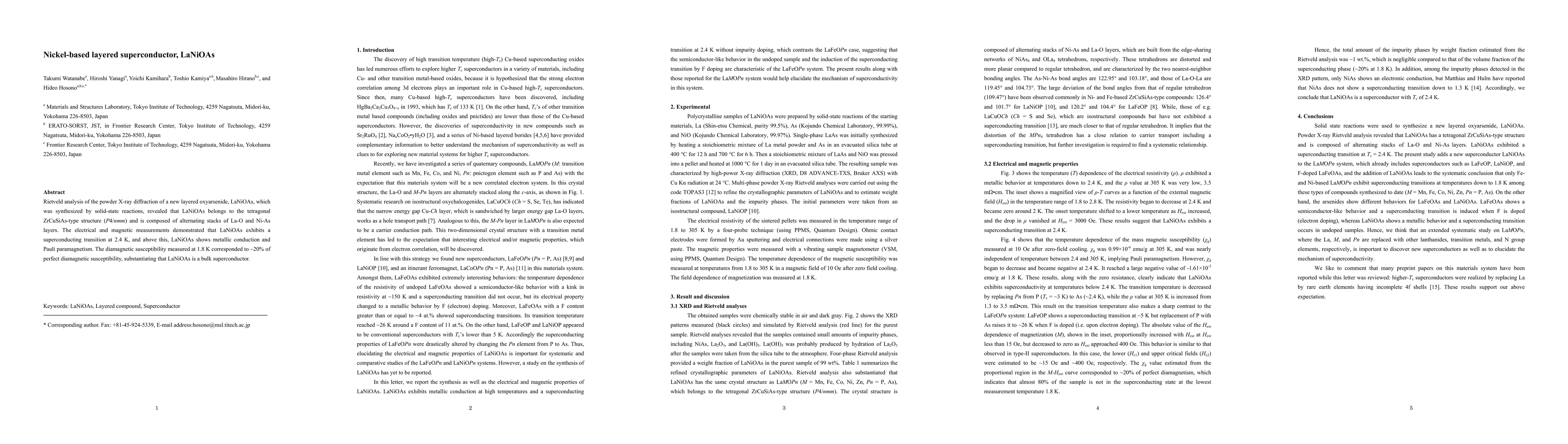 LaNiOAs is a bulk superconductor with a superconducting transition at 2.4 K, exhibiting metallic conduction and Pauli paramagnetism above this temperature. Its tetragonal structure features alternating La-O and Ni-As layers.