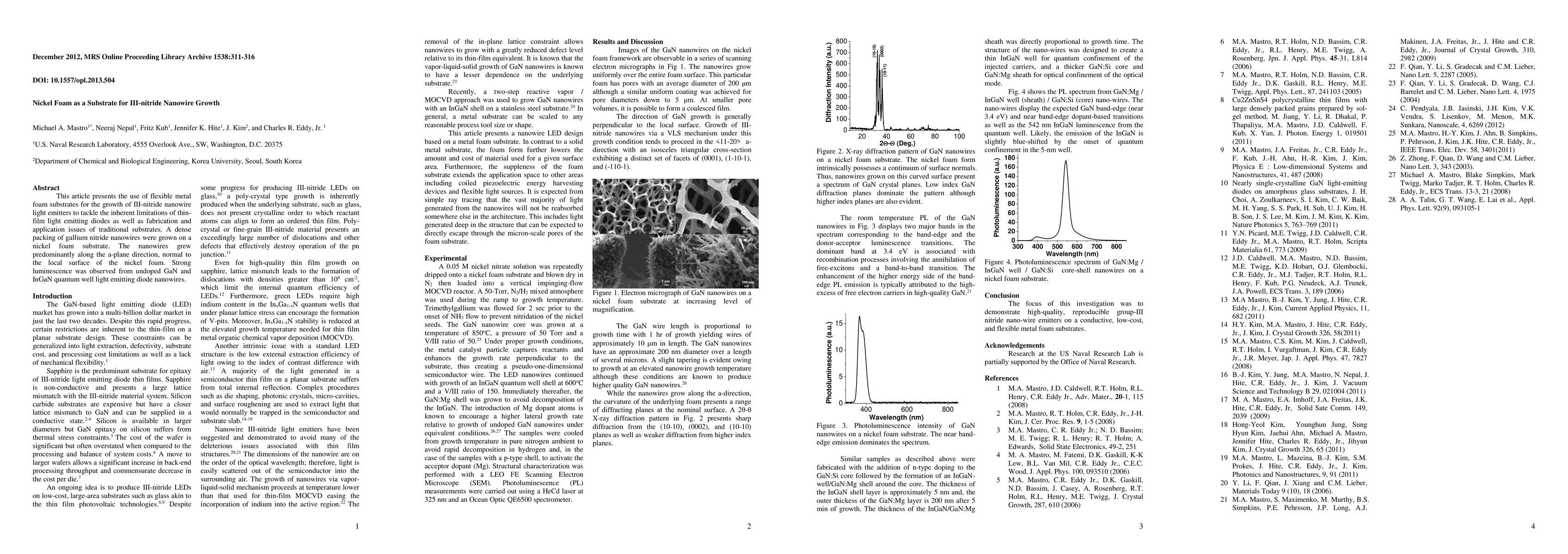 The paper presents a novel approach to growing III-nitride nanowire light emitters on nickel foam substrates, utilizing its conductivity, low cost, and flexibility.