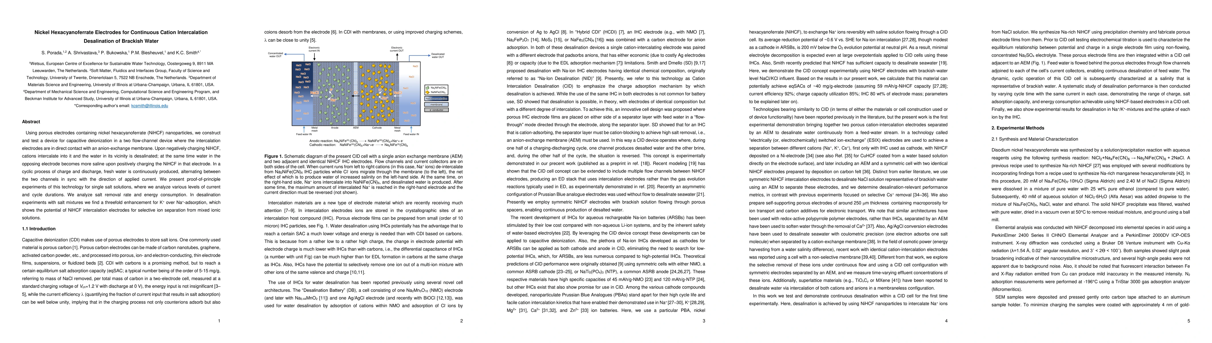 This paper presents a capacitive deionization device using nickel hexacyanoferrate electrodes for continuous desalination of brackish water, demonstrating selective ion intercalation and a threefold enhancement in K$^+$ over Na$^+$ adsorption, alongside analysis of energy consumption and salt removal rates.