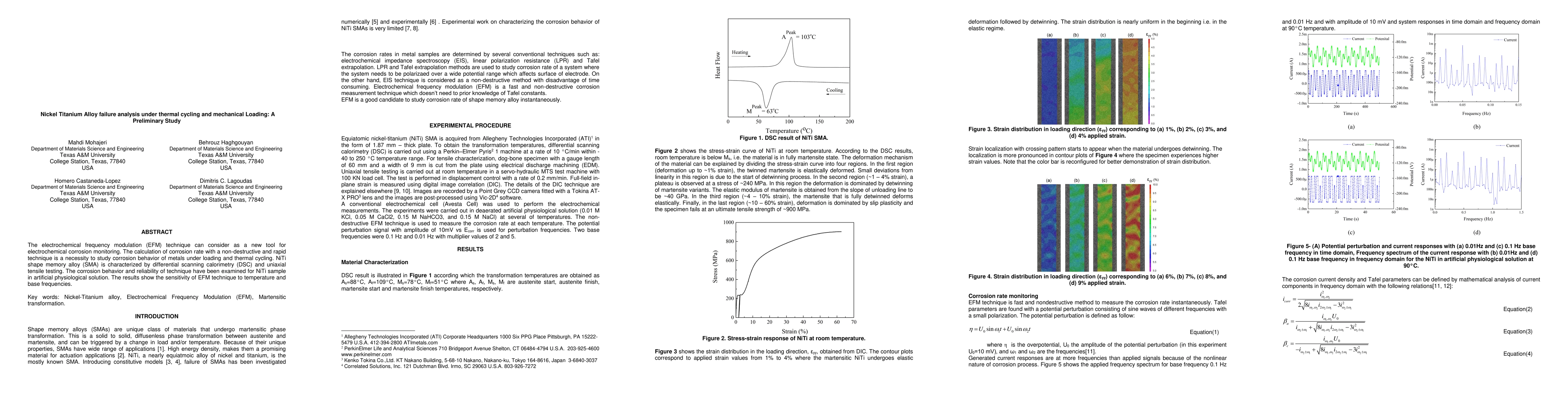 The electrochemical frequency modulation (EFM) technique can consider as a new tool for electrochemical corrosion monitoring. The calculation of corrosion rate with a non-destructive and rapid technique is a necessity to study corrosion behavior of metals under loading and thermal cycling. NiTi shape memory alloy (SMA) is characterized by differential scanning calorimetry (DSC) and uniaxial tensile testing. The corrosion behavior and reliability of technique have been examined for NiTi sample in artificial physiological solution. The results show the sensitivity of EFM technique to temperature and base frequencies.
