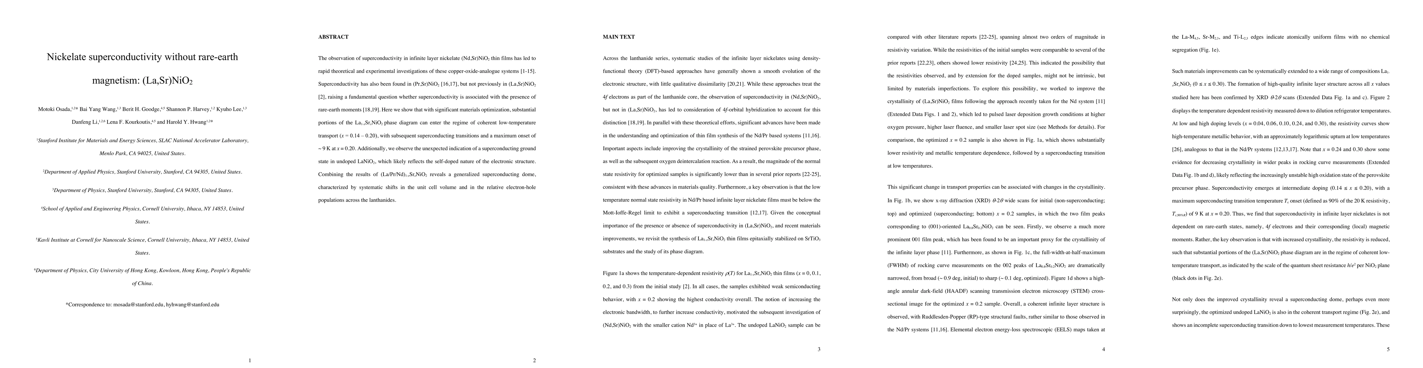 This paper reports the discovery of superconductivity in (La,Sr)NiO$_{2}$ without rare-earth magnetism, achieving a maximum onset temperature of ~9 K at $x$ = 0.20 through materials optimization. It also finds a superconducting ground state in undoped LaNiO$_{2}$, suggesting a self-doped nature, and highlights a generalized superconducting dome across various nickelate systems.