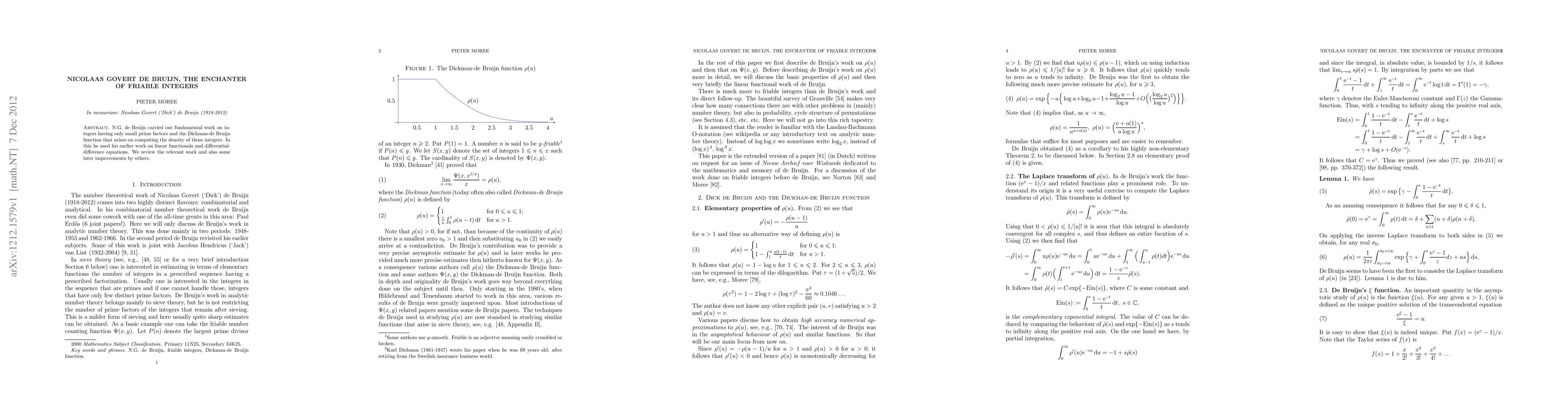 Nicolaas Govert de Bruijn made significant contributions to the study of integers with small prime factors, including the development of the Dickman-de Bruijn function to determine their density, leveraging his expertise in linear functionals and differential-difference equations. Subsequent researchers have further refined his foundational work.