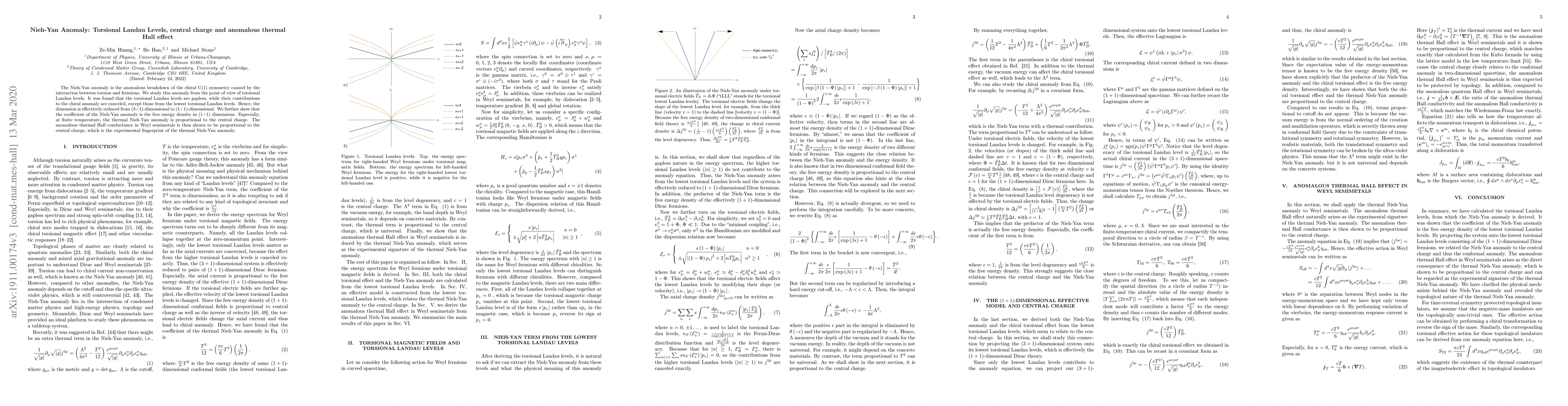 The Nieh-Yan anomaly, caused by the interaction between torsion and fermions, is studied through torsional Landau levels, revealing a reduction in effective dimension and a connection to the central charge. The thermal Nieh-Yan anomaly correlates with the central charge and manifests as an anomalous thermal Hall effect in Weyl semimetals.