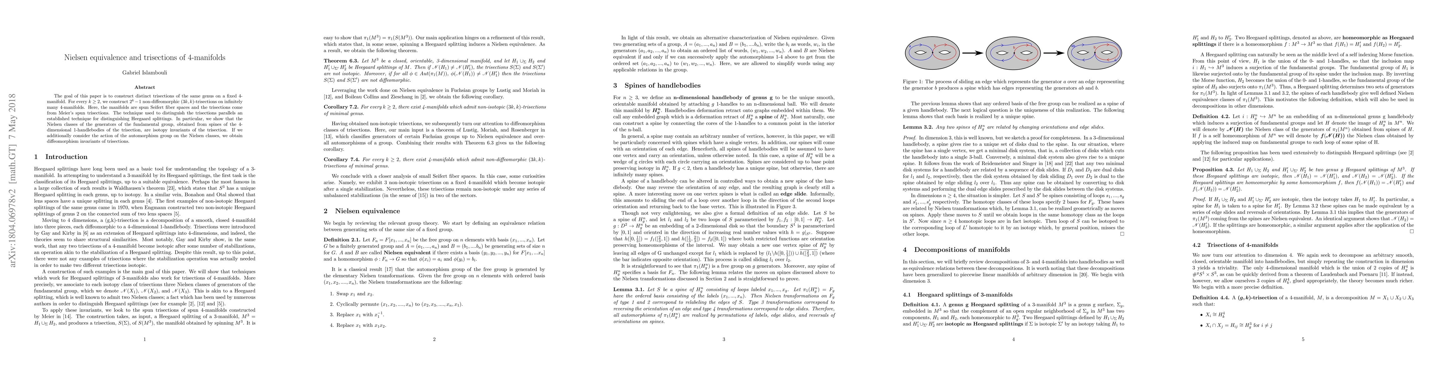 The goal of this paper is to construct distinct trisections of the same genus on a fixed 4-manifold. For every $k \geq 2$, we construct $2^{k}-1$ non-diffeomorphic $(3k,k)$-trisections on infinitely many 4-manifolds. Here, the manifolds are spun Seifert fiber spaces and the trisections come from Meier's spun trisections. The technique used to distinguish the trisections parallels an established technique for distinguishing Heegaard splittings. In particular, we show that the Nielsen classes of the generators of the fundamental group, obtained from spines of the 4-dimensional 1-handlebodies of the trisection, are isotopy invariants of the trisection. If we additionally consider the action of the automorphism group on the Nielsen classes, we obtain diffeomorphism invariants of trisections.