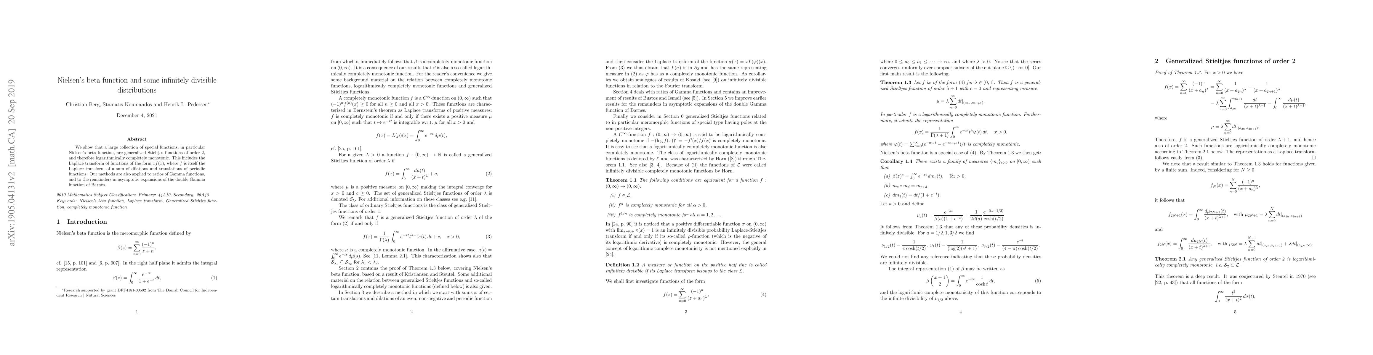 We show that a large collection of special functions, in particular Nielsen's beta function, are generalized Stieltjes functions of order 2, and therefore logarithmically completely monotonic. This includes the Laplace transform of functions of the form $xf(x)$, where $f$ is itself the Laplace transform of a sum of dilations and translations of periodic functions. Our methods are also applied to ratios of Gamma functions, and to the remainders in asymptotic expansions of the double Gamma function of Barnes.