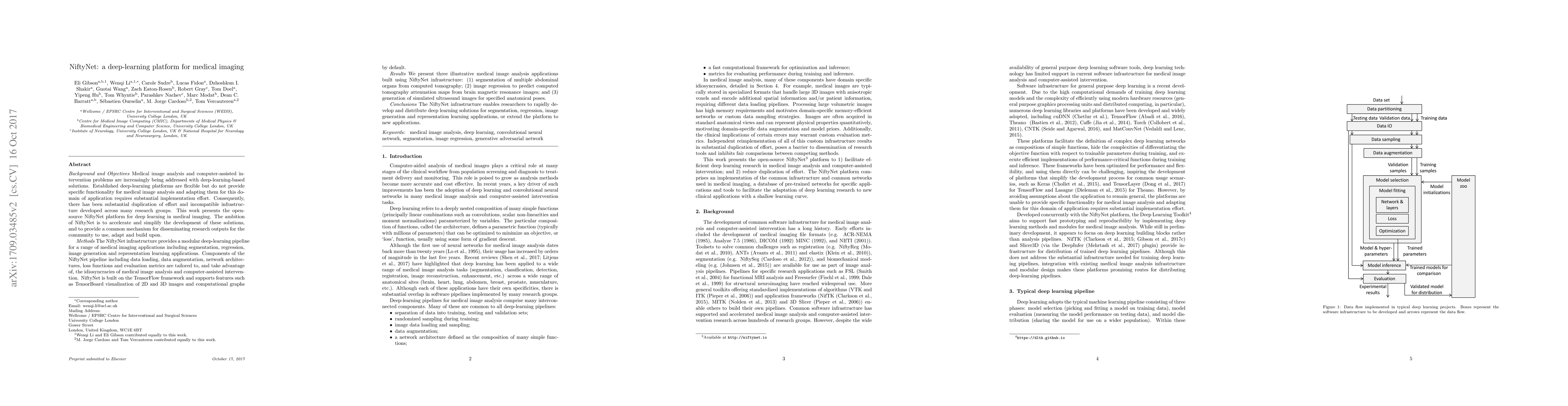 NiftyNet is an open-source deep-learning platform tailored for medical imaging, aiming to simplify and accelerate the development of solutions for tasks like segmentation and regression. It provides a modular pipeline and supports TensorFlow, with applications including organ segmentation, image regression, and simulated ultrasound generation.