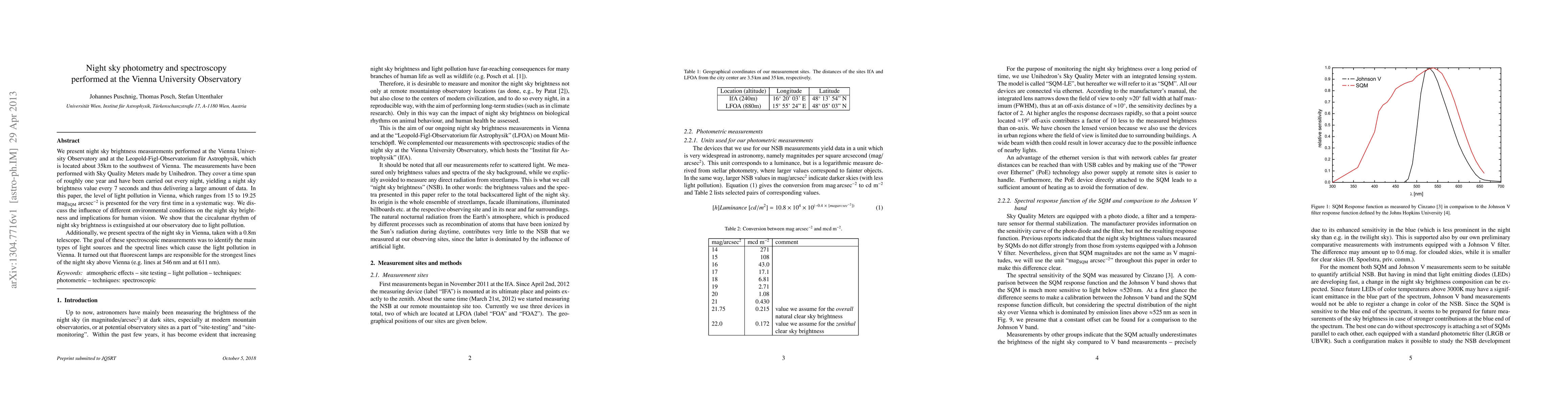 This paper reports on systematic night sky brightness measurements and spectroscopy conducted at the Vienna University Observatory and Leopold-Figl-Observatorium, revealing light pollution levels ranging from 15 to 19.25 magnitudes per square arcsecond. The study identifies fluorescent lamps as the primary source of light pollution, particularly affecting the circalunar rhythm of night sky brightness.