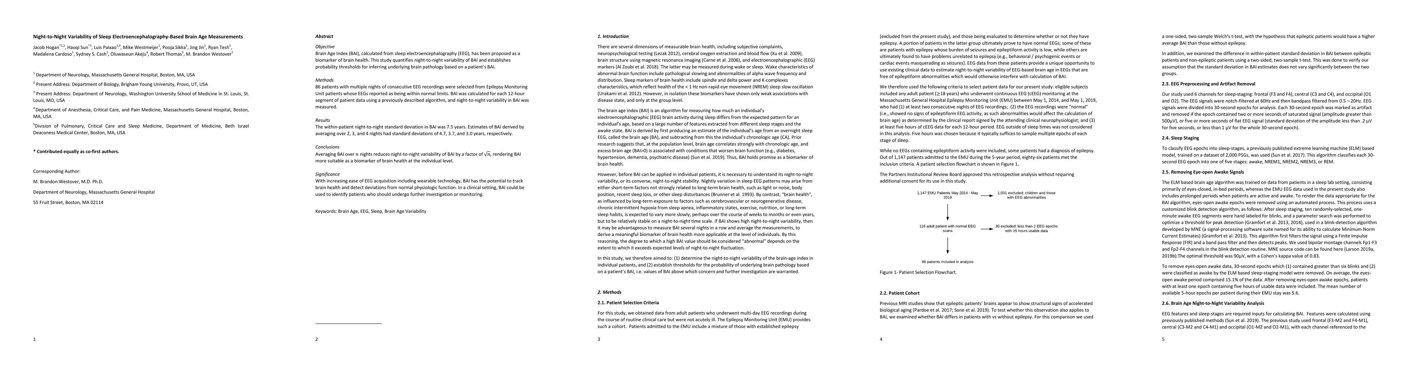 Objective Brain Age Index (BAI), calculated from sleep electroencephalography (EEG), has been proposed as a biomarker of brain health. This study quantifies night-to-night variability of BAI and establishes probability thresholds for inferring underlying brain pathology based on a patient's BAI. Methods 86 patients with multiple nights of consecutive EEG recordings were selected from Epilepsy Monitoring Unit patients whose EEGs reported as being within normal limits. BAI was calculated for each 12-hour segment of patient data using a previously described algorithm, and night-to-night variability in BAI was measured. Results The within-patient night-to-night standard deviation in BAI was 7.5 years. Estimates of BAI derived by averaging over 2, 3, and 4 nights had standard deviations of 4.7, 3.7, and 3.0 years, respectively. Conclusions Averaging BAI over n nights reduces night-to-night variability of BAI by a factor of the square root of n, rendering BAI more suitable as a biomarker of brain health at the individual level. Significance With increasing ease of EEG acquisition including wearable technology, BAI has the potential to track brain health and detect deviations from normal physiologic function. In a clinical setting, BAI could be used to identify patients who should undergo further investigation or monitoring.