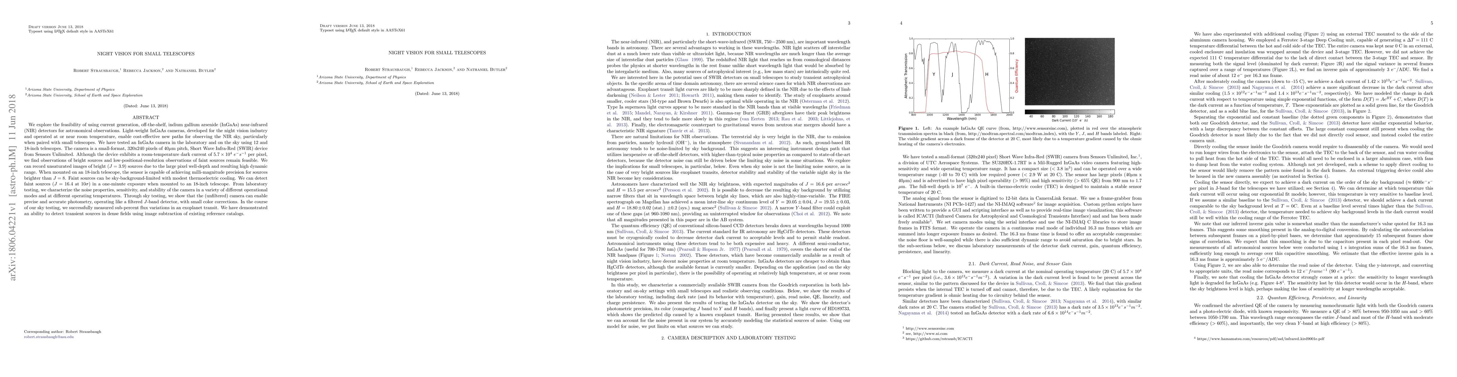 We explore the feasibility of using current generation, off-the-shelf, indium gallium arsenide (InGaAs) near-infrared (NIR) detectors for astronomical observations. Light-weight InGaAs cameras, developed for the night vision industry and operated at or near room temperature, enable cost-effective new paths for observing the NIR sky, particularly when paired with small telescopes. We have tested an InGaAs camera in the laboratory and on the sky using 12 and 18-inch telescopes. The camera is a small-format, 320x240 pixels of 40$\mu$m pitch, Short Wave Infra-Red (SWIR) device from Sensors Unlimited. Although the device exhibits a room-temperature dark current of $5.7 \times 10^4$ $e^-s^{-1}$ per pixel, we find observations of bright sources and low-positional-resolution observations of faint sources remain feasible. We can record unsaturated images of bright ($J=3.9$) sources due to the large pixel well-depth and resulting high dynamic range. When mounted on an 18-inch telescope, the sensor is capable of achieving milli-magnitude precision for sources brighter than $J=8$. Faint sources can be sky-background-limited with modest thermoelectric cooling. We can detect faint sources ($J=16.4$ at $10\sigma$) in a one-minute exposure when mounted to an 18-inch telescope. From laboratory testing, we characterize the noise properties, sensitivity, and stability of the camera in a variety of different operational modes and at different operating temperatures. Through sky testing, we show that the (unfiltered) camera can enable precise and accurate photometry, operating like a filtered $J$-band detector, with small color corrections. In the course of our sky testing, we successfully measured sub-percent flux variations in an exoplanet transit. We have demonstrated an ability to detect transient sources in dense fields using image subtraction of existing reference catalogs.