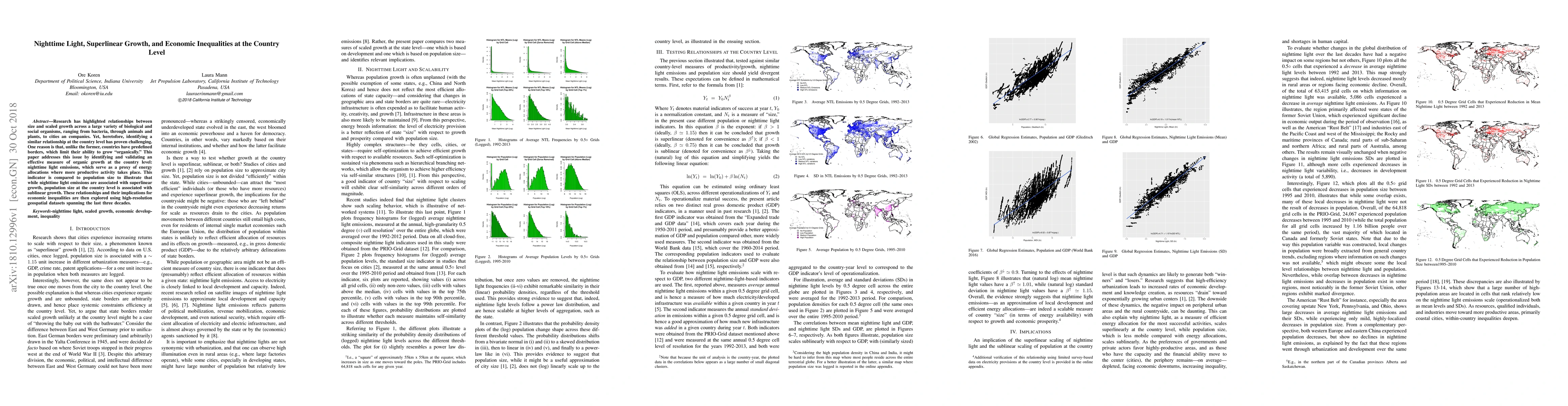 This paper identifies nighttime light emissions as a proxy for organic growth at the country level, demonstrating a superlinear growth relationship, while population size exhibits sublinear growth. The study uses high-resolution geospatial data to explore the implications of these relationships for economic inequalities across countries over the past three decades.