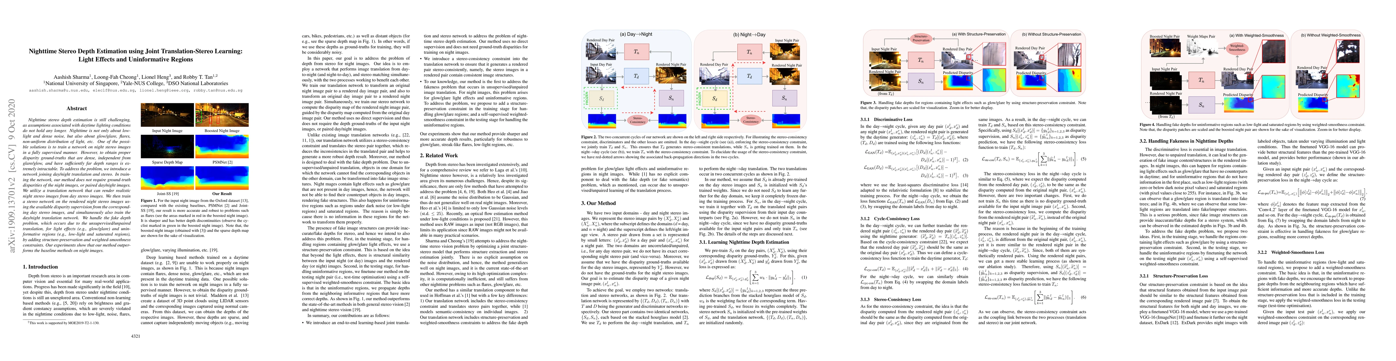 Nighttime stereo depth estimation is still challenging, as assumptions associated with daytime lighting conditions do not hold any longer. Nighttime is not only about low-light and dense noise, but also about glow/glare, flares, non-uniform distribution of light, etc. One of the possible solutions is to train a network on night stereo images in a fully supervised manner. However, to obtain proper disparity ground-truths that are dense, independent from glare/glow, and have sufficiently far depth ranges is extremely intractable. To address the problem, we introduce a network joining day/night translation and stereo. In training the network, our method does not require ground-truth disparities of the night images, or paired day/night images. We utilize a translation network that can render realistic night stereo images from day stereo images. We then train a stereo network on the rendered night stereo images using the available disparity supervision from the corresponding day stereo images, and simultaneously also train the day/night translation network. We handle the fake depth problem, which occurs due to the unsupervised/unpaired translation, for light effects (e.g., glow/glare) and uninformative regions (e.g., low-light and saturated regions), by adding structure-preservation and weighted-smoothness constraints. Our experiments show that our method outperforms the baseline methods on night images.