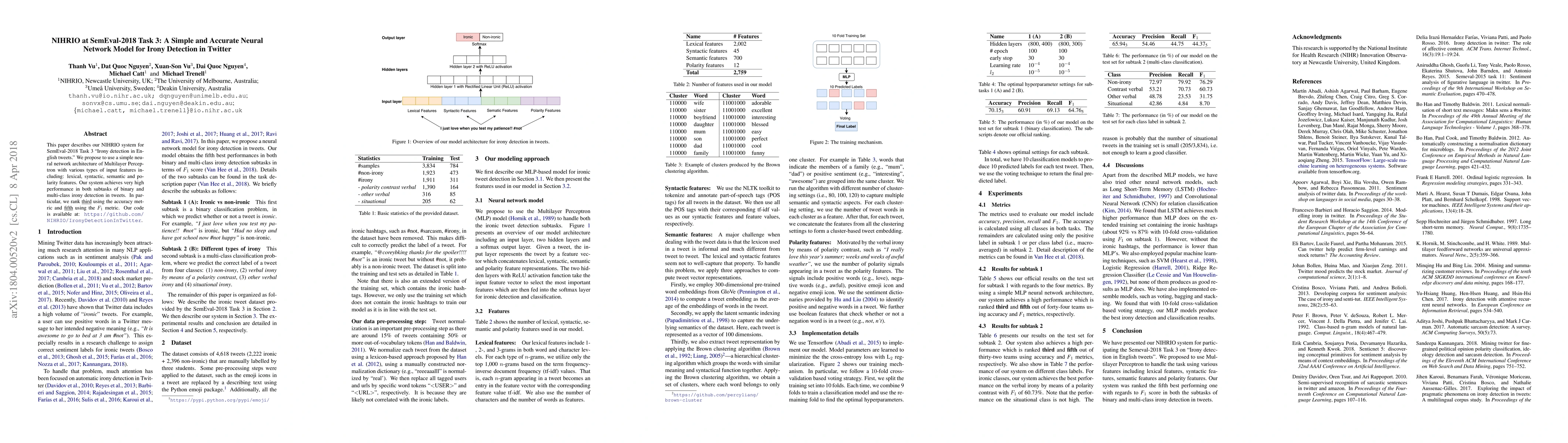 NIHRIO presented a neural network model utilizing multilayer perceptron with diverse input features for irony detection in tweets in SemEval-2018 Task 3. The system achieved notable rankings, emphasizing its simplicity and accuracy.