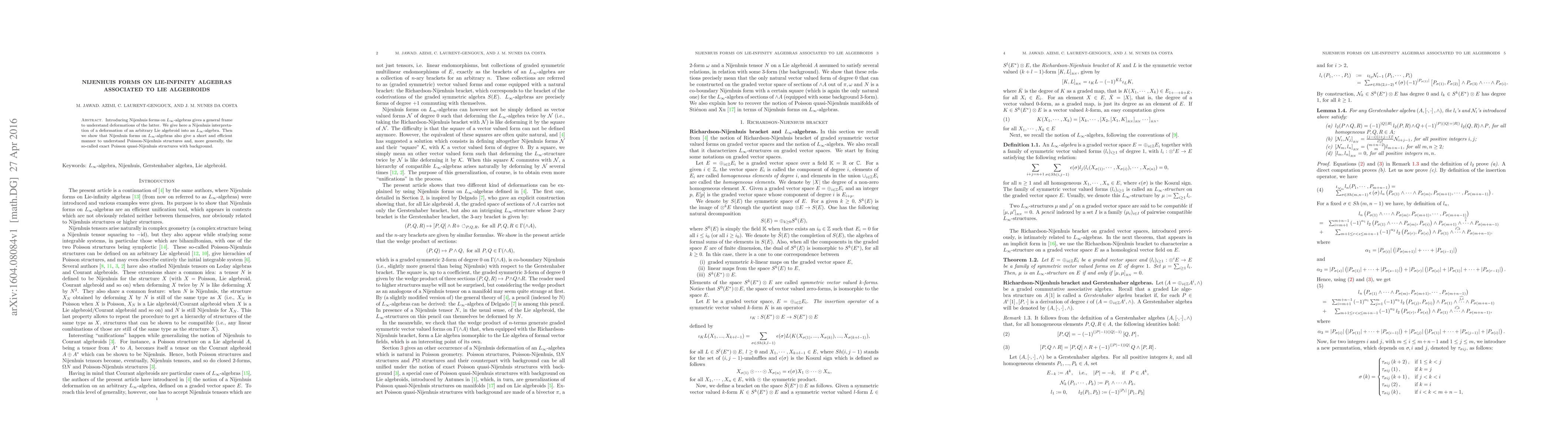 This paper introduces Nijenhuis forms on Lie-infinity algebras to study deformations of Lie algebroids into Lie-infinity algebras and explains their role in understanding Poisson-Nijenhuis and exact Poisson quasi-Nijenhuis structures with background.