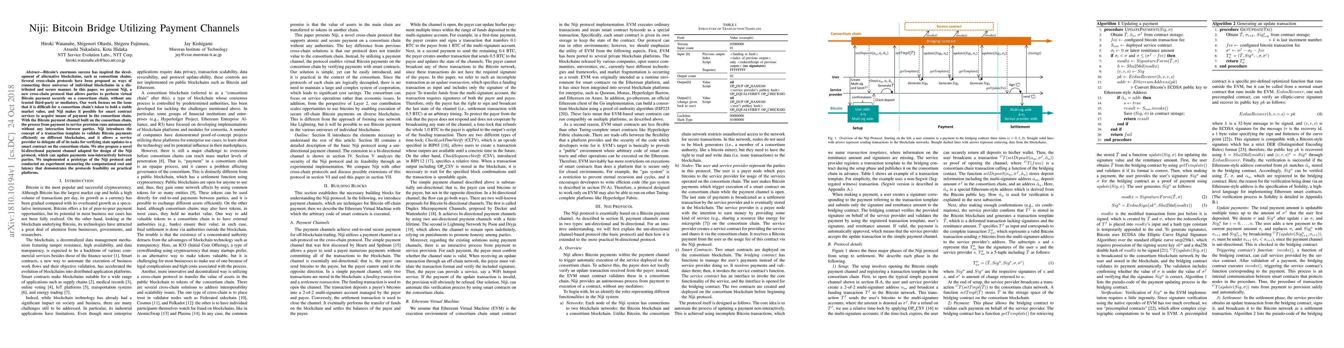 Niji is a cross-chain protocol enabling Bitcoin payments on a consortium chain without third-party mediators, addressing the challenge of maintaining stable market value for consortium tokens. It introduces a bi-directional payment channel and transaction templates for efficient validation, demonstrating feasibility through a prototype implementation.