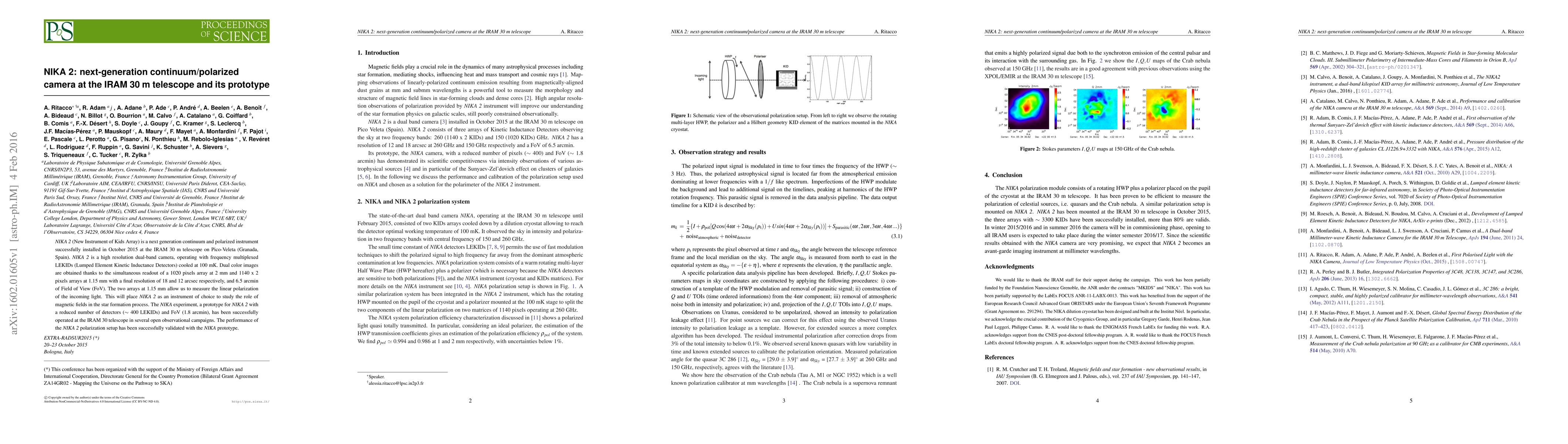 NIKA 2 is a high-resolution dual-band camera installed at the IRAM 30 m telescope, utilizing LEKIDs to study continuum and polarized light, enhancing our understanding of magnetic fields in star formation. The NIKA prototype successfully validated the performance of the NIKA 2 polarization setup.