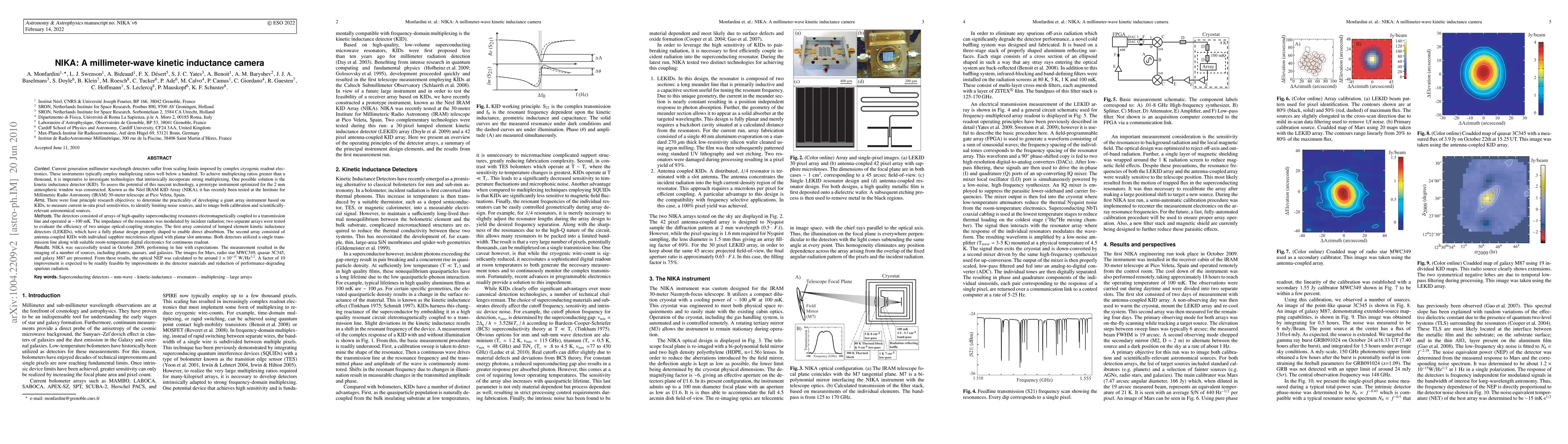 The NIKA camera, utilizing kinetic inductance detectors (KIDs), was developed to overcome scaling limits in millimeter-wave detection. Initial tests at the IRAM telescope successfully imaged various celestial objects, demonstrating an optical NEP of $1 \times 10^{-15}$ W/Hz$^{1/2}$ and potential for a 10-fold improvement through material enhancements.