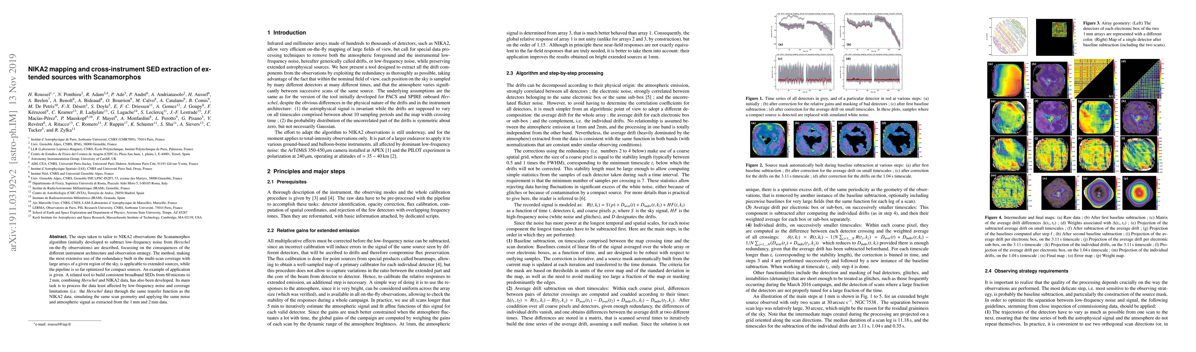 The steps taken to tailor to NIKA2 observations the Scanamorphos algorithm (initially developed to subtract low-frequency noise from Herschel on-the-fly observations) are described, focussing on the consequences of the different instrument architecture and observation strategy. The method, making the most extensive use of the redundancy built in the multi-scan coverage with large arrays of a given region of the sky, is applicable to extended sources, while the pipeline is so far optimized for compact sources. An example of application is given. A related tool to build consistent broadband SEDs from 60 microns to 2 mm, combining Herschel and NIKA2 data, has also been developed. Its main task is to process the data least affected by low-frequency noise and coverage limitations (i.e. the Herschel data) through the same transfer function as the NIKA2 data, simulating the same scan geometry and applying the same noise and atmospheric signal as extracted from the 1 mm and 2 mm data.
