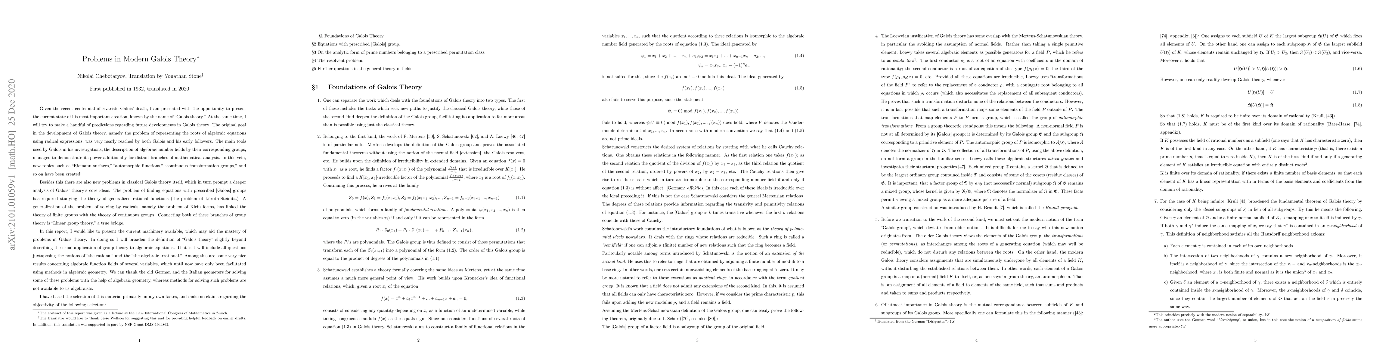 This is an English translation of Nikolai Chebotaryov's paper "Die Probleme der modernen Galoisschen Theorie" from 1932. An excerpt from this paper was given as a lecture at the International Congress of Mathematicians in Z\"urich in 1932. With the lecture being given to commememorate the centennial of Evariste Galois' death, the paper is a broad survey of various contemporary problems in Galois Theory the author found represented the culminations of work done by Galois and his successors.