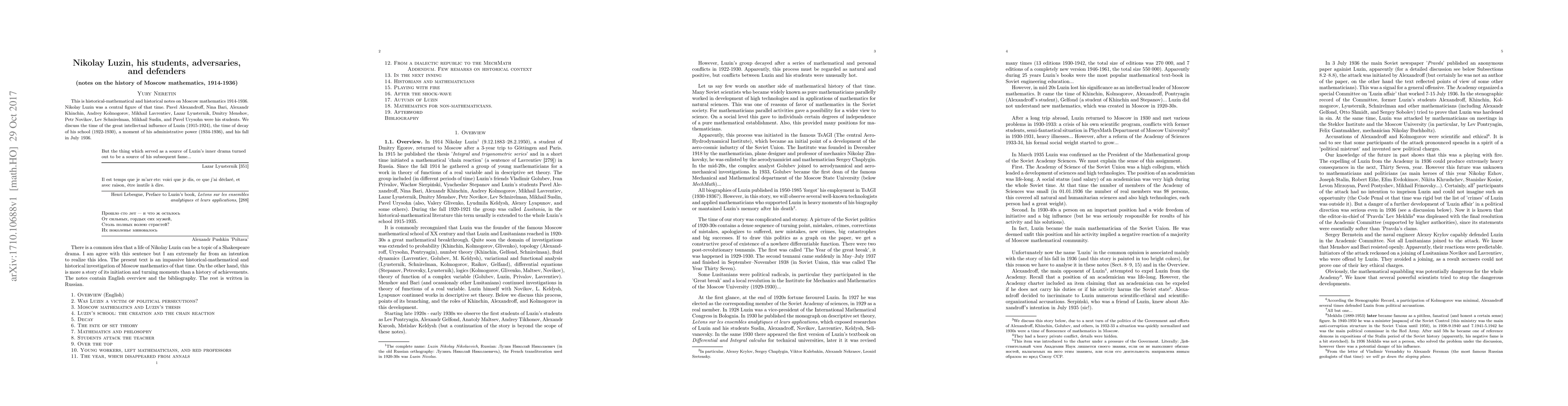 This is historical-mathematical and historical notes on Moscow mathematics 1914-1936. Nikolay Luzin was a central figure of that time. Pavel Alexandroff, Nina Bari, Alexandr Khinchin, Andrey Kolmogorov, Mikhail Lavrentiev, Lazar Lyusternik, Dmitry Menshov, Petr Novikov, Lev Schnirelman, Mikhail Suslin, and Pavel Urysohn were his students. We discuss the time of the great intellectual influence of Luzin (1915-1924), the time of decay of his school (1922-1930), a moment of his administrative power (1934-1936), and his fall in July 1936.