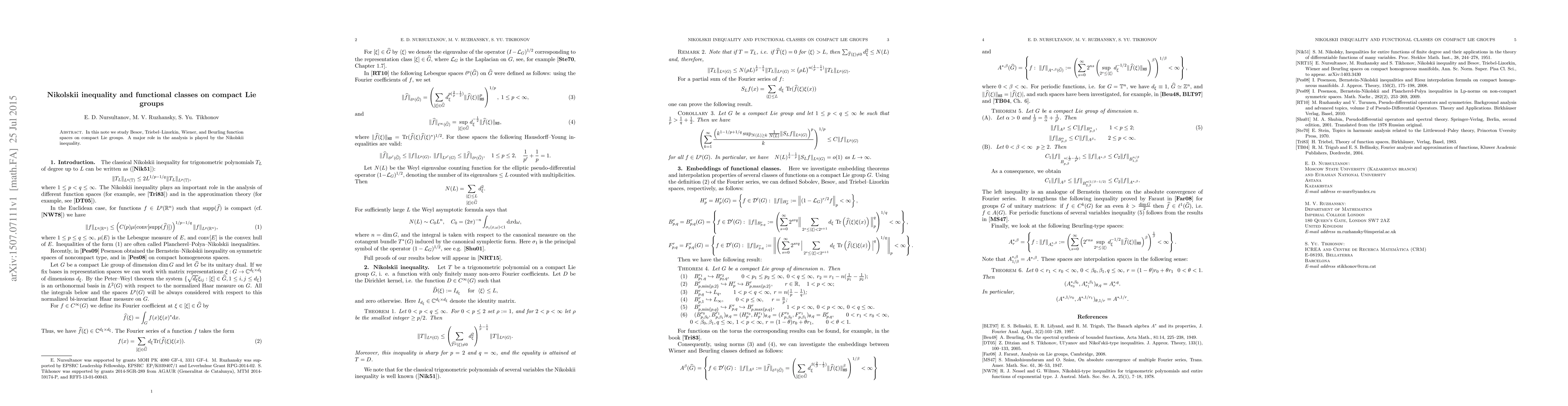 Summary: This paper investigates Besov, Triebel-Lizorkin, Wiener, and Beurling function spaces on compact Lie groups, emphasizing the pivotal role of the Nikolskii inequality in the analysis. The study highlights the application of the Nikolskii inequality in understanding these functional classes.