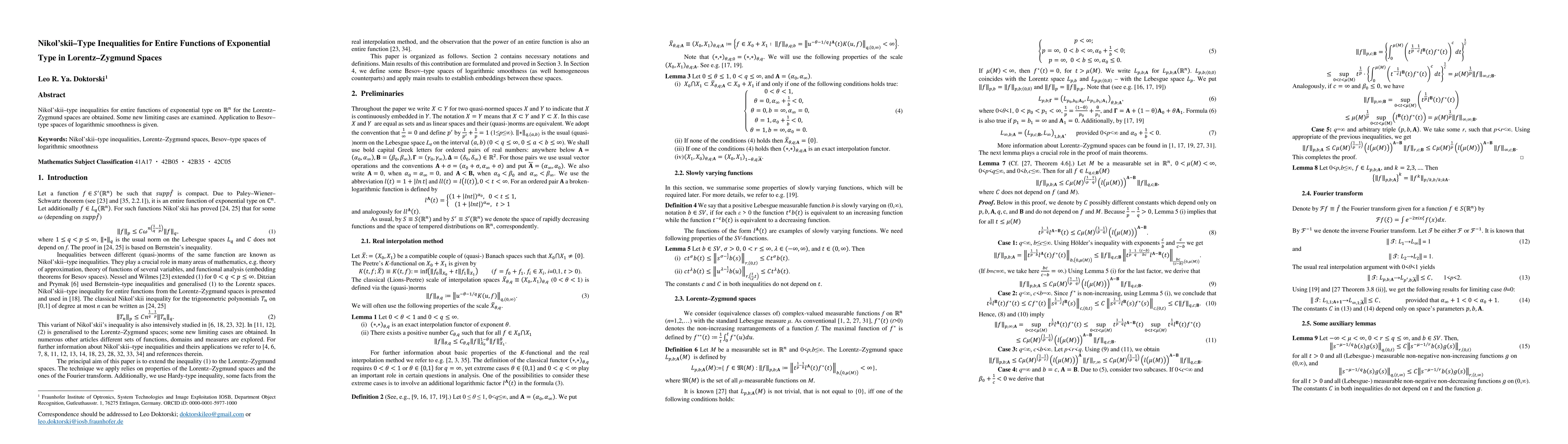 Summary: The paper establishes Nikolskii type inequalities for entire functions of exponential type within Lorentz Zygmund spaces, exploring new limiting cases. It also applies these results to Besov type spaces characterized by logarithmic smoothness.