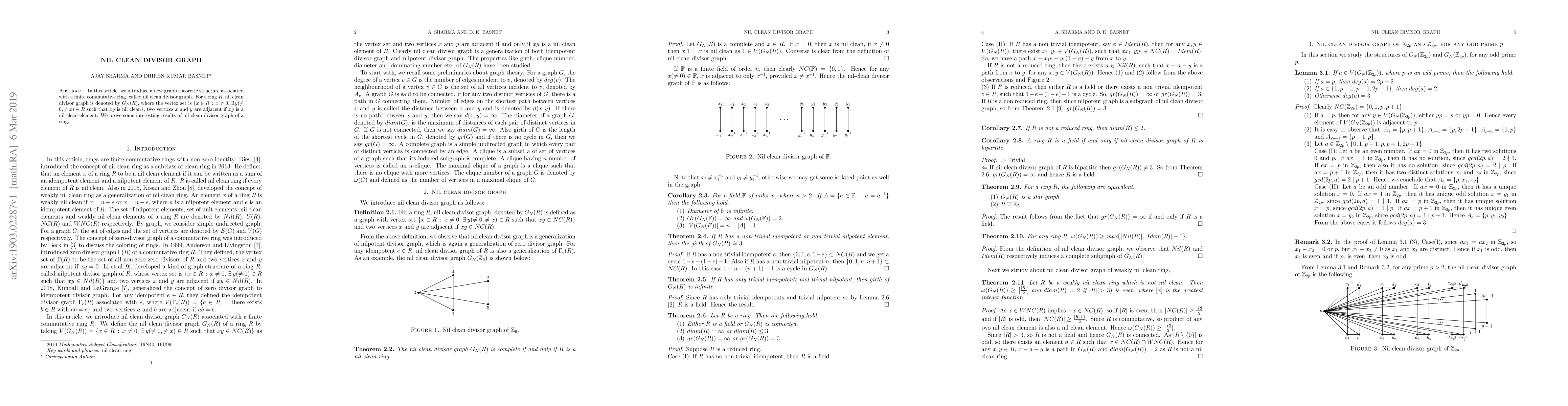 This paper introduces the nil clean divisor graph $G_N(R)$ for a finite commutative ring $R$, where vertices represent non-zero elements connected by edges if their product is a nil clean element. The authors prove several properties of these graphs.