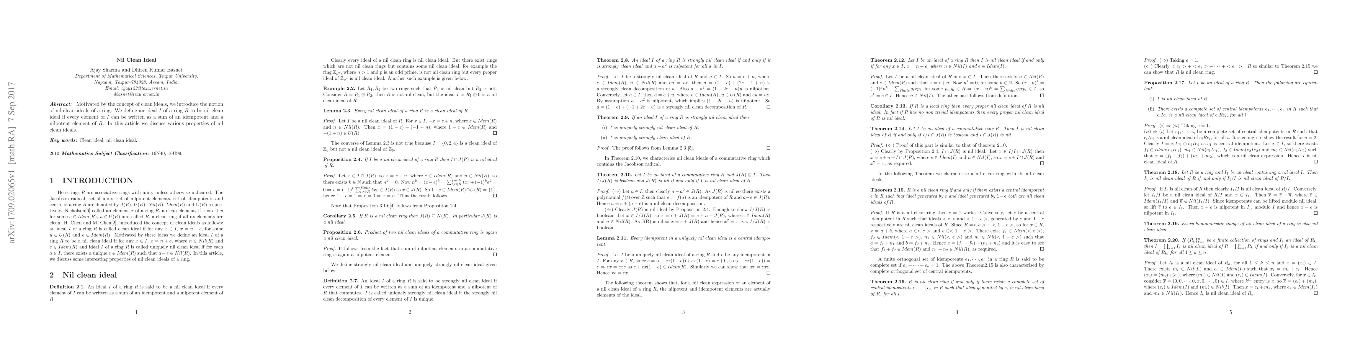Motivated by the concept of clean ideals, we introduce the notion of nil clean ideals of a ring. We define an ideal $I$ of a ring $R$ to be nil clean ideal if every element of $I$ can be written as a sum of an idempotent and a nilpotent element of $R$. In this article we discuss various properties of nil clean ideals.