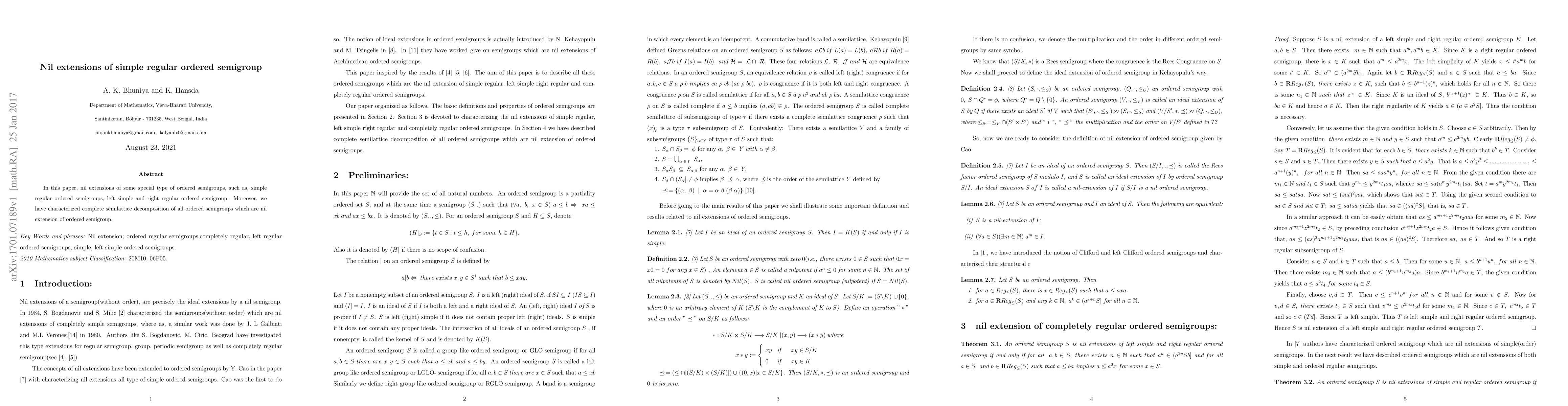 The paper presents detailed proofs and conditions for nil extensions of simple regular ordered semigroups and completely regular ordered semigroups, contributing to the theoretical framework of semigroup theory.