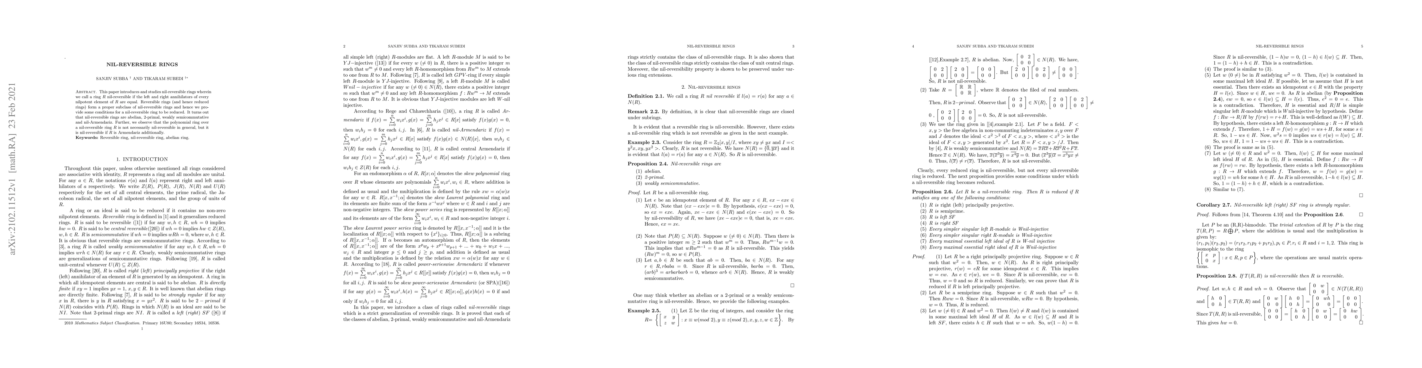 This paper explores nil-reversible rings where the left and right annihilators of every nilpotent element are equal, noting they encompass reversible rings and identifying conditions for a nil-reversible ring to be reduced. It concludes that nil-reversible rings are abelian, 2-primal, weakly semicommutative, and nil-Armendariz, though polynomial rings over such rings are not necessarily nil-reversible unless the base ring is also Armendariz.