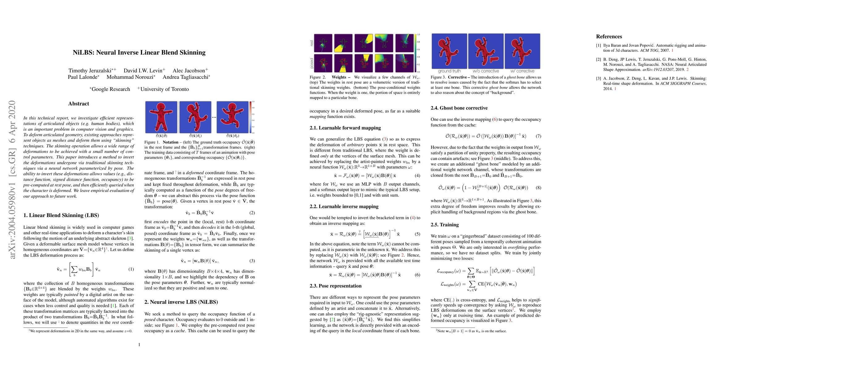 This paper introduces NiLBS, a neural network method for inverting deformations from traditional skinning techniques in articulated objects, enabling efficient pre-computation and querying of values like distance functions during deformation. Future work will include empirical evaluation of the proposed approach.