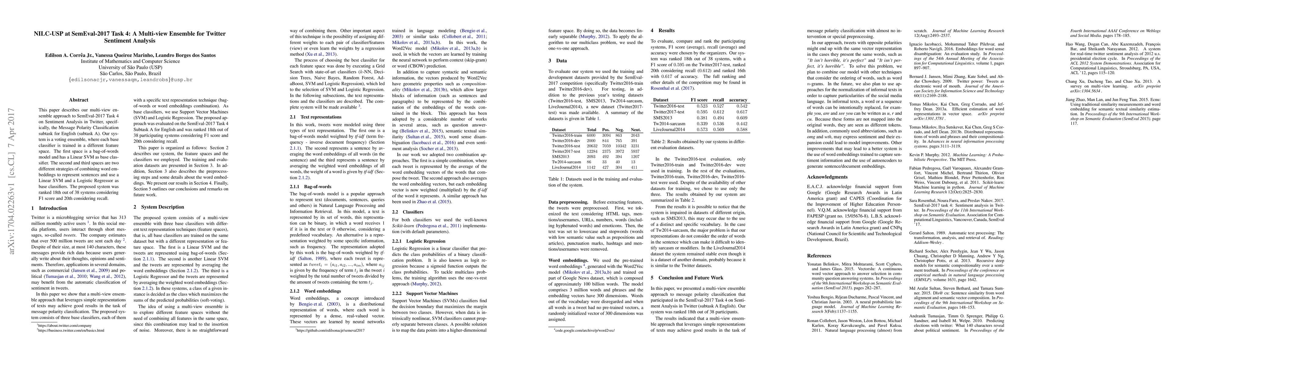 This paper describes our multi-view ensemble approach to SemEval-2017 Task 4 on Sentiment Analysis in Twitter, specifically, the Message Polarity Classification subtask for English (subtask A). Our system is a voting ensemble, where each base classifier is trained in a different feature space. The first space is a bag-of-words model and has a Linear SVM as base classifier. The second and third spaces are two different strategies of combining word embeddings to represent sentences and use a Linear SVM and a Logistic Regressor as base classifiers. The proposed system was ranked 18th out of 38 systems considering F1 score and 20th considering recall.