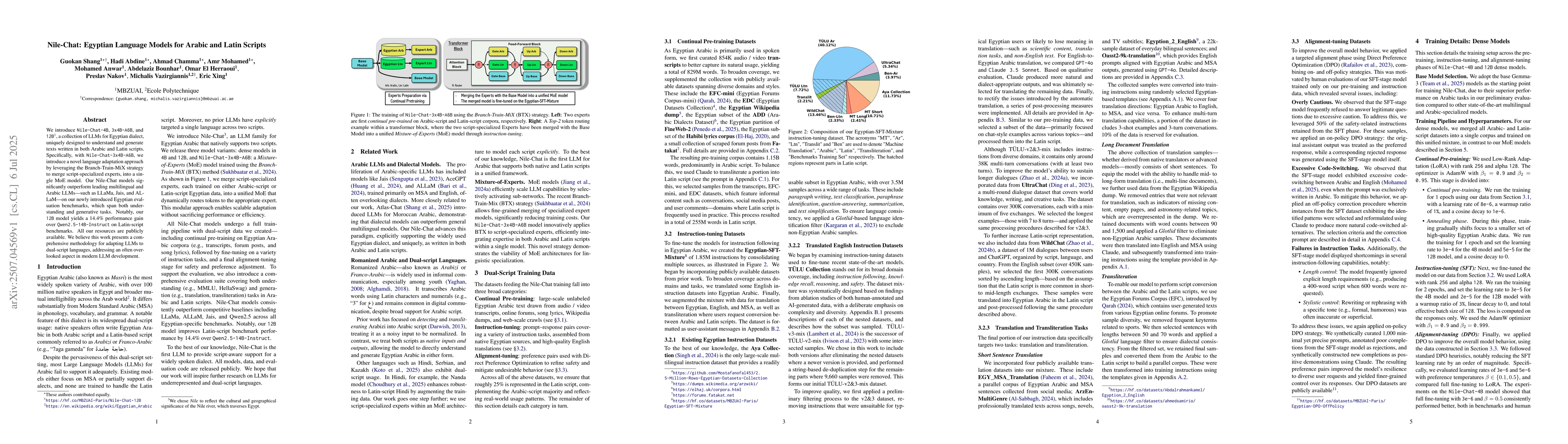 We introduce Nile-Chat-4B, 3x4B-A6B, and 12B, a collection of LLMs for Egyptian dialect, uniquely designed to understand and generate texts written in both Arabic and Latin scripts. Specifically, with Nile-Chat-3x4B-A6B, we introduce a novel language adaptation approach by leveraging the Branch-Train-MiX strategy to merge script-specialized experts, into a single MoE model. Our Nile-Chat models significantly outperform leading multilingual and Arabic LLMs, such as LLaMa, Jais, and ALLaM, on our newly introduced Egyptian evaluation benchmarks, which span both understanding and generative tasks. Notably, our 12B model yields a 14.4% performance gain over Qwen2.5-14B-Instruct on Latin-script benchmarks. All our resources are publicly available. We believe this work presents a comprehensive methodology for adapting LLMs to dual-script languages, addressing an often overlooked aspect in modern LLM development.