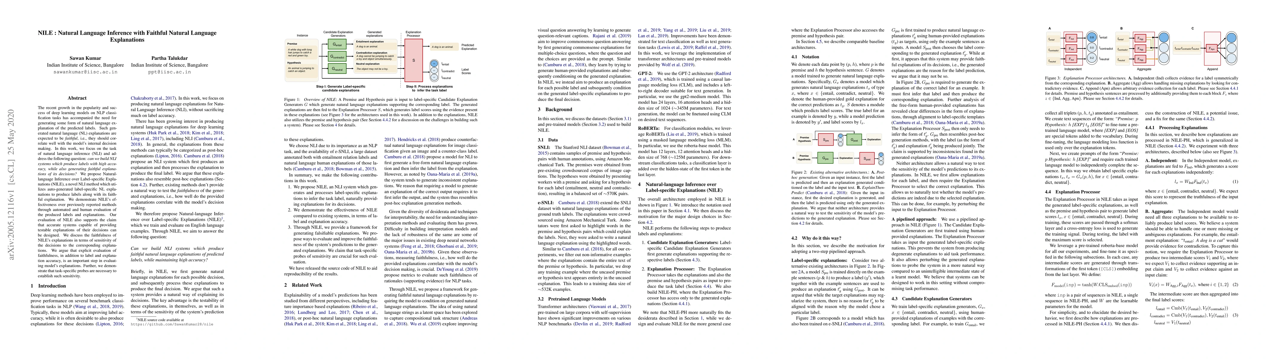 This paper proposes NILE, a method for natural language inference that generates high-accuracy labels and faithful, label-specific natural language explanations. The authors demonstrate that NILE outperforms previous methods and argue that explicit evaluation of explanation faithfulness is crucial for model evaluation.