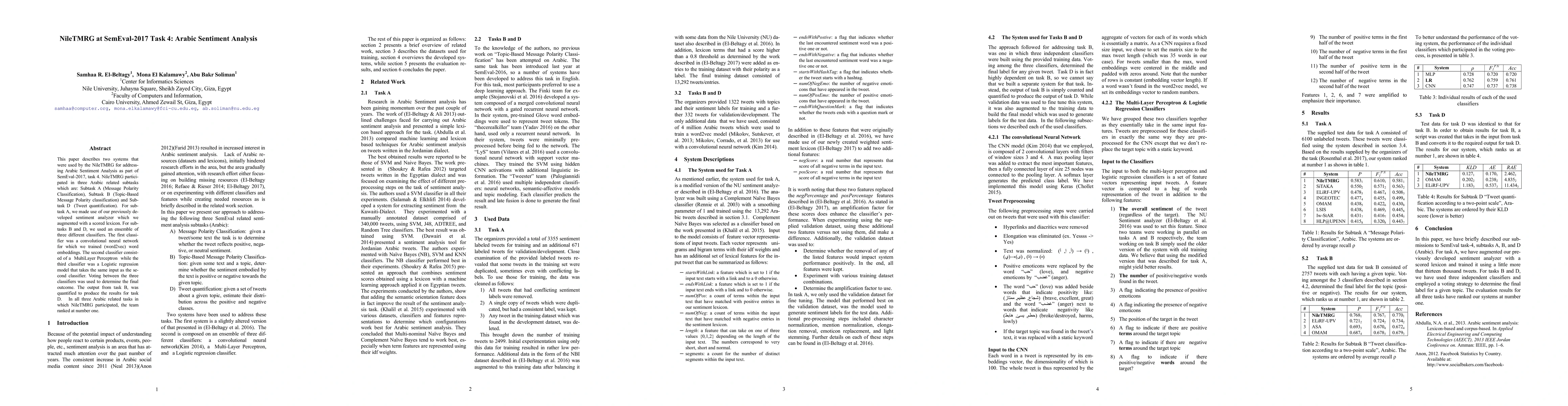 This paper describes two systems that were used by the authors for addressing Arabic Sentiment Analysis as part of SemEval-2017, task 4. The authors participated in three Arabic related subtasks which are: Subtask A (Message Polarity Classification), Sub-task B (Topic-Based Message Polarity classification) and Subtask D (Tweet quantification) using the team name of NileTMRG. For subtask A, we made use of our previously developed sentiment analyzer which we augmented with a scored lexicon. For subtasks B and D, we used an ensemble of three different classifiers. The first classifier was a convolutional neural network for which we trained (word2vec) word embeddings. The second classifier consisted of a MultiLayer Perceptron, while the third classifier was a Logistic regression model that takes the same input as the second classifier. Voting between the three classifiers was used to determine the final outcome. The output from task B, was quantified to produce the results for task D. In all three Arabic related tasks in which NileTMRG participated, the team ranked at number one.