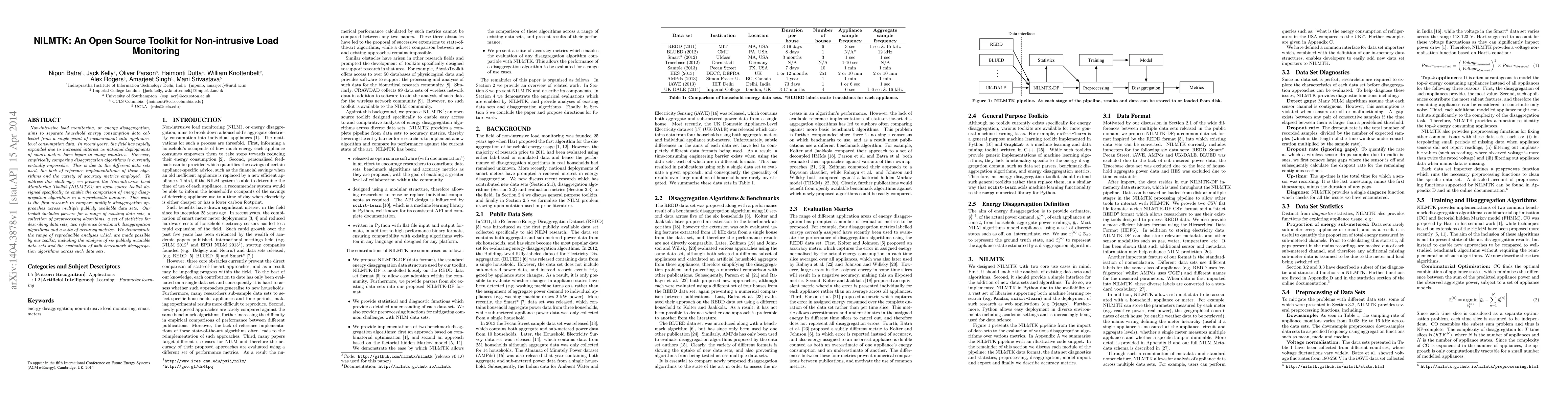 The NILMTK toolkit provides open source tools for comparing non-intrusive load monitoring algorithms, addressing the lack of standardized datasets and reference implementations. It facilitates reproducible analyses across multiple publicly available datasets and includes benchmark algorithms and accuracy metrics.
