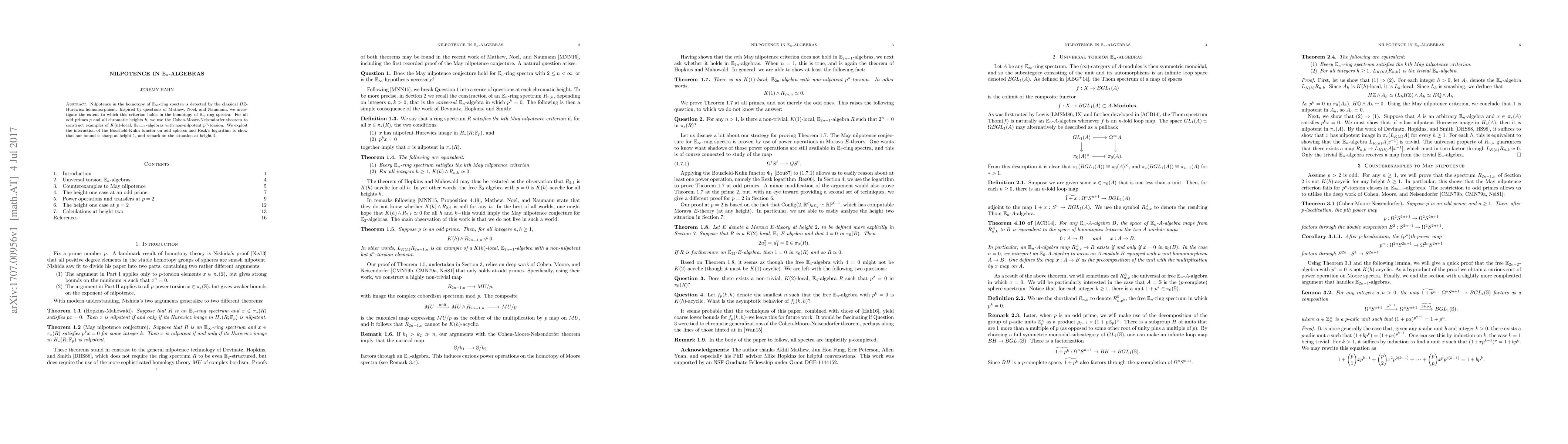 Nilpotence in the homotopy of $\mathbb{E}_\infty$-ring spectra is detected by the classical $H\mathbb{Z}$-Hurewicz homomorphism. Inspired by questions of Mathew, Noel, and Naumann, we investigate the extent to which this criterion holds in the homotopy of $\mathbb{E}_n$-ring spectra. For all odd primes $p$ and all chromatic heights $h$, we use the Cohen-Moore-Neisendorfer theorem to construct examples of $K(h)$-local, $\mathbb{E}_{2n-1}$-algebras with non-nilpotent $p^n$-torsion. We exploit the interaction of the Bousfield-Kuhn functor on odd spheres and Rezk's logarithm to show that our bound is sharp at height $1$, and remark on the situation at height $2$.