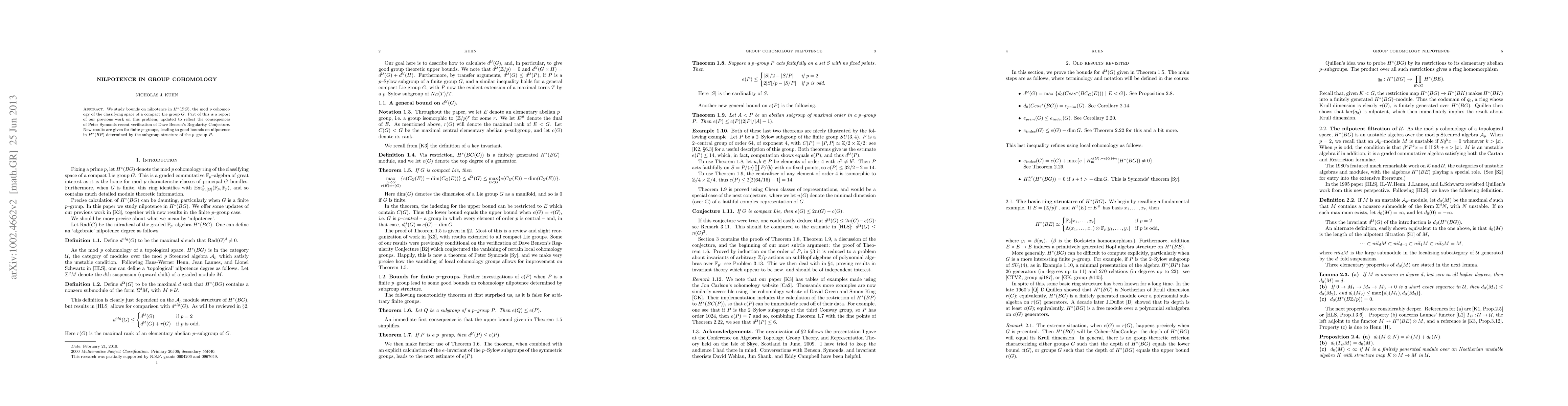 We study bounds on nilpotence in H*(BG), the mod p cohomology of the classifying space of a compact Lie group G. Part of this is a report of our previous work on this problem, updated to reflect the consequences of Peter Symonds recent verification of Dave Benson's Regularity Conjecture. New results are given for finite p--groups, leading to good bounds on nilpotence in H*(BP) determined by the subgroup structure of the p--group P.