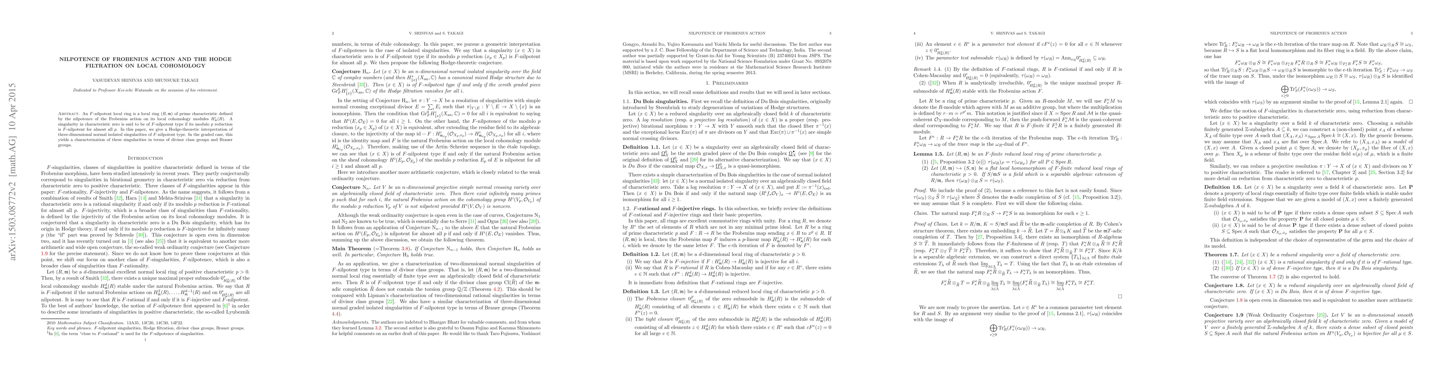 This paper explores $F$-nilpotent local rings, defined by the nilpotence of the Frobenius action on local cohomology modules, and examines three-dimensional normal isolated singularities of $F$-nilpotent type through Hodge-theoretic interpretation, leading to characterizations in terms of divisor class groups and Brauer groups.