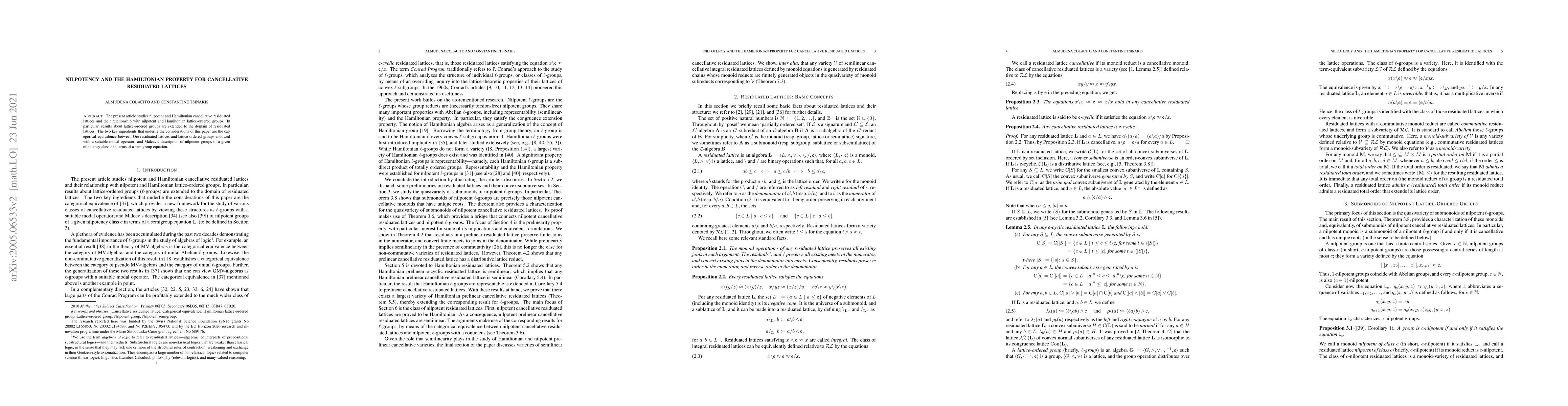 The present article studies nilpotent and Hamiltonian cancellative residuated lattices and their relationship with nilpotent and Hamiltonian lattice-ordered groups. In particular, results about lattice-ordered groups are extended to the domain of residuated lattices. The two key ingredients that underlie the considerations of this paper are the categorical equivalence between Ore residuated lattices and lattice-ordered groups endowed with a suitable modal operator; and Malcev's description of nilpotent groups of a given nilpotency class c in terms of a semigroup equation.