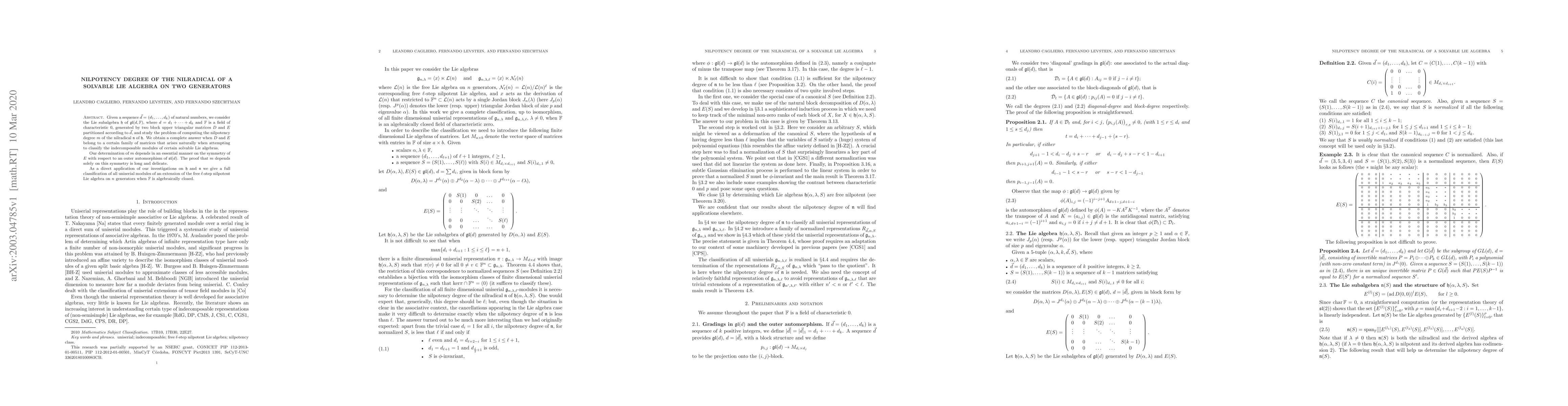 Given a sequence $\vec d=(d_1,\dots,d_k)$ of natural numbers, we consider the Lie subalgebra $\mathfrak{h}$ of $\mathfrak{gl}(d,\mathbb{F})$, where $d=d_1+\cdots +d_k$ and $\mathbb{F}$ is a field of characteristic 0, generated by two block upper triangular matrices $D$ and $E$ partitioned according to $\vec d$, and study the problem of computing the nilpotency degree $m$ of the nilradical $\mathfrak{n}$ of $\mathfrak{h}$. We obtain a complete answer when $D$ and $E$ belong to a certain family of matrices that arises naturally when attempting to classify the indecomposable modules of certain solvable Lie algebras. Our determination of $m$ depends in an essential manner on the symmetry of $E$ with respect to an outer automorphism of $\mathfrak{sl}(d)$. The proof that $m$ depends solely on this symmetry is long and delicate. As a direct application of our investigations on $\mathfrak{h}$ and $\mathfrak{n}$ we give a full classification of all uniserial modules of an extension of the free $\ell$-step nilpotent Lie algebra on $n$ generators when $\mathbb{F}$ is algebraically closed.