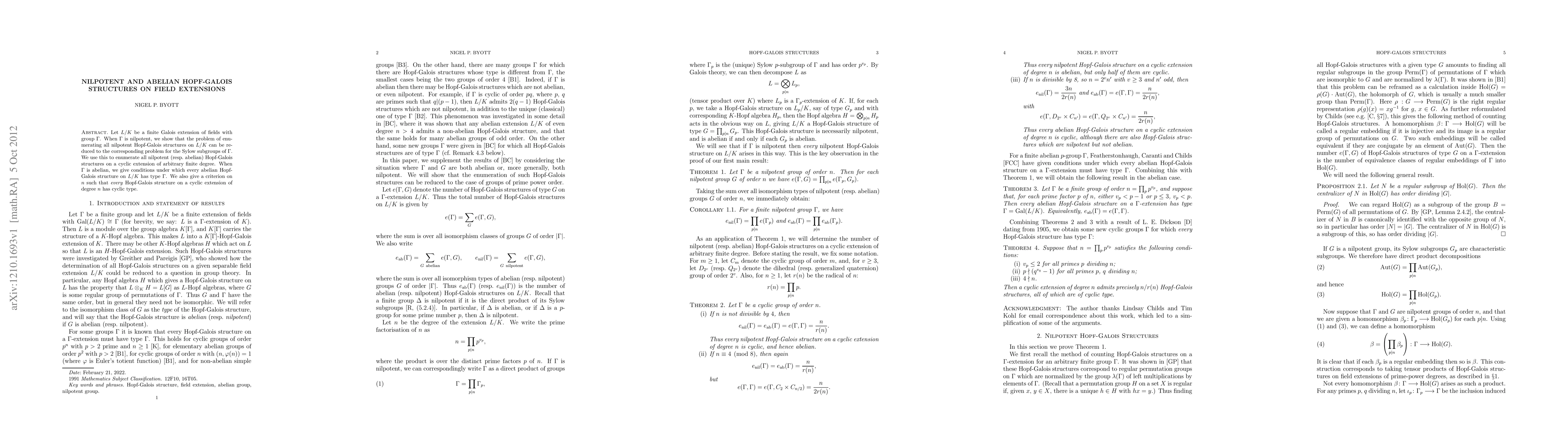 This paper investigates nilpotent and abelian Hopf-Galois structures on finite Galois field extensions where the Galois group is nilpotent or abelian. It demonstrates how the enumeration problem for nilpotent structures can be simplified by focusing on Sylow subgroups and provides conditions for abelian structures to have type $\Gamma$.