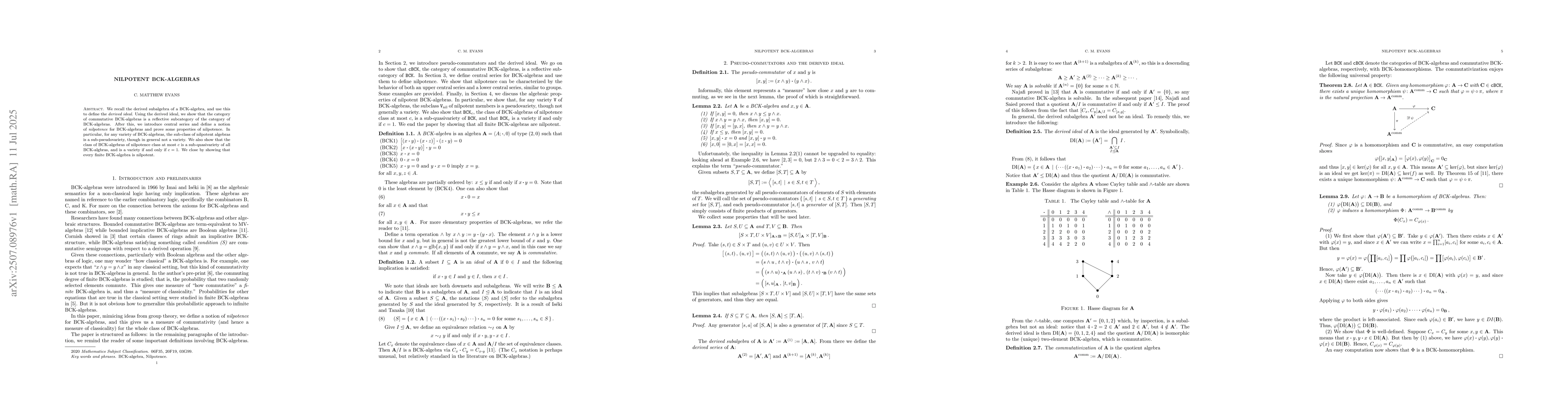 We recall the derived subalgebra of a BCK-algebra, and use this to define the derived ideal. Using the derived ideal, we show that the category of commutative BCK-algebras is a reflective subcategory of the category of BCK-algebras. After this, we introduce central series and define a notion of nilpotence for BCK-algebras and prove some properties of nilpotence. In particular, for any variety of BCK-algebras, the sub-class of nilpotent algebras is a sub-pseudovariety, though in general not a variety. We also show that the class of BCK-algebras of nilpotence class at most $c$ is a sub-quasivariety of all BCK-algebras, and is a variety if and only if $c=1$. We close by showing that every finite BCK-algebra is nilpotent.