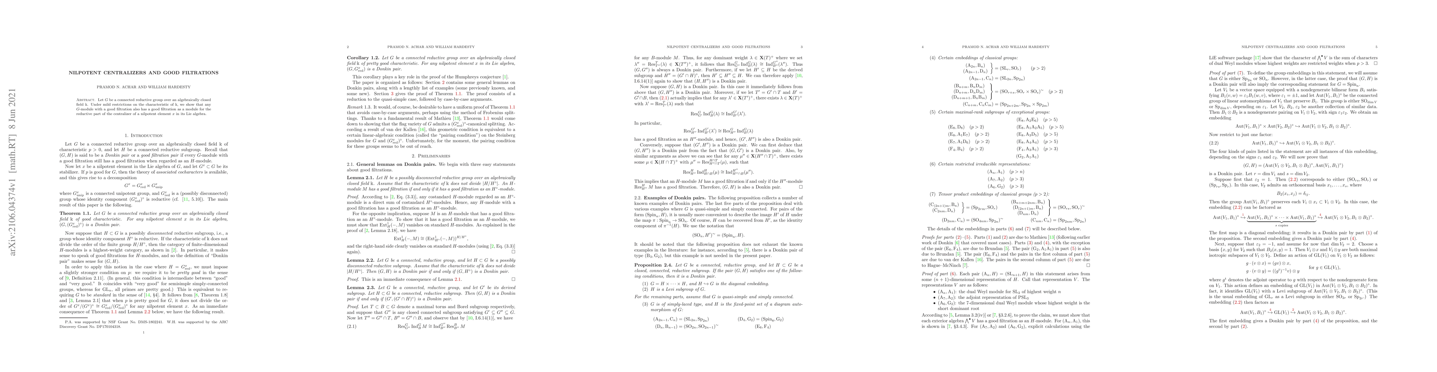 Let $G$ be a connected reductive group over an algebraically closed field $\Bbbk$. Under mild restrictions on the characteristic of $\Bbbk$, we show that any $G$-module with a good filtration also has a good filtration as a module for the reductive part of the centralizer of a nilpotent element $x$ in its Lie algebra.
