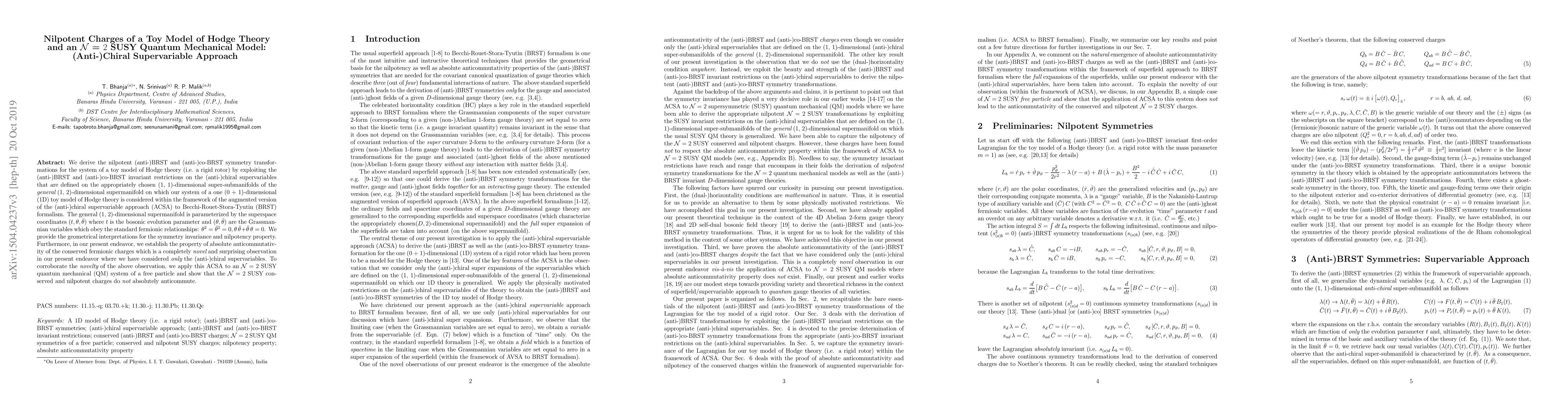 We derive the nilpotent (anti-)BRST and (anti-)co-BRST symmetry transformations for the system of a toy model of Hodge theory (i.e. a rigid rotor) by exploiting the (anti-)BRST and (anti-)co-BRST invariant restrictions on the (anti-)chiral supervariables that are defined on the appropriately chosen (1, 1)-dimensional super-submanifolds of the {\it general} (1, 2)-dimensional supermanifold on which our system of a one (0 + 1)-dimensional (1D) toy model of Hodge theory is considered within the framework of the augmented version of the (anti-)chiral supervariable approach (ACSA) to Becchi-Rouet-Stora-Tyutin (BRST) formalism. The general (1, 2)-dimensional supermanifold is parameterized by the superspace coordinates ($t, \theta, \bar\theta$) where $t$ is the bosonic evolution parameter and ($\theta, \bar\theta$) are the Grassmannian variables which obey the standard fermionic relationships: $ {\theta}^2 = {\bar\theta}^2 = 0, {\theta}\,{\bar\theta} + {\bar\theta}\,{\theta} = 0 $. We provide the geometrical interpretations for the symmetry invariance and nilpotency property. Furthermore, in our present endeavor, we establish the property of absolute anticommutativity of the conserved fermionic charges which is a completely {\it novel} and surprising observation in our present endeavor where we have considered {\it only} the (anti-)chiral supervariables. To corroborate the {\it novelty} of the above observation, we apply this ACSA to an ${\cal N} = 2$ SUSY quantum mechanical (QM) system of a free particle and show that the ${\cal N} = 2$ SUSY conserved and nilpotent charges do {\it not} absolutely anticommute.