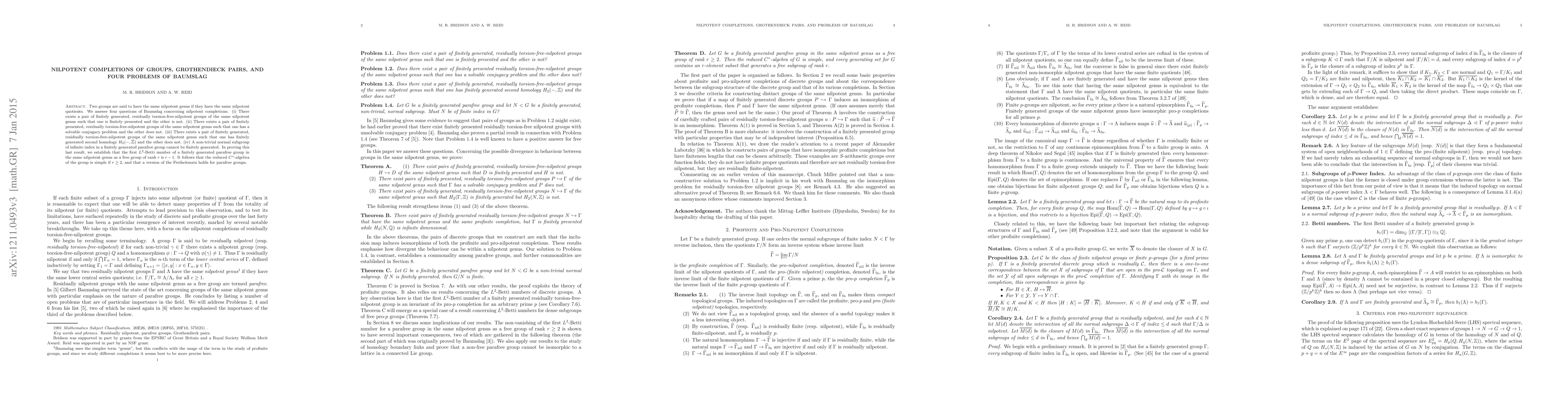 Two groups are said to have the same nilpotent genus if they have the same nilpotent quotients. We answer four questions of Baumslag concerning nilpotent completions. (i) There exists a pair of finitely generated, residually torsion-free-nilpotent groups of the same nilpotent genus such that one is finitely presented and the other is not. (ii) There exists a pair of finitely presented, residually torsion-free-nilpotent groups of the same nilpotent genus such that one has a solvable conjugacy problem and the other does not. (iii) There exists a pair of finitely generated, residually torsion-free-nilpotent groups of the same nilpotent genus such that one has finitely generated second homology $H_2(-,\Z)$ and the other does not. (iv) A non-trivial normal subgroup of infinite index in a finitely generated parafree group cannot be finitely generated. In proving this last result, we establish that the first $L^2$ betti number of a finitely generated parafree group of rank $r$ is $r-1$. It follows that the reduced $C^*$-algebra of the group is simple if $r\ge 2$, and that a version of the Freiheitssatz holds for parafree groups.