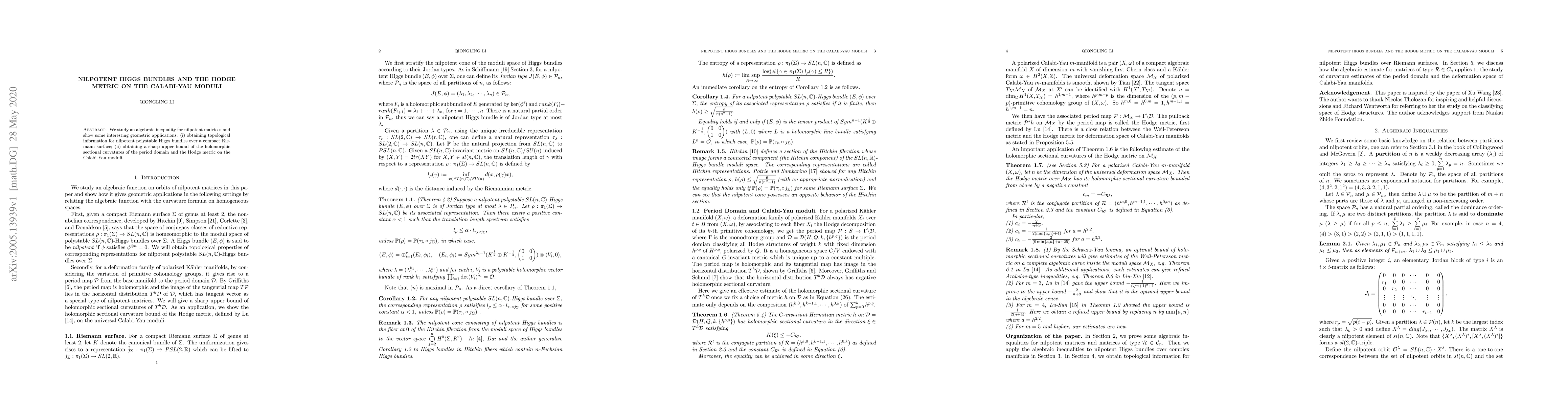 We study an algebraic inequality for nilpotent matrices and show some interesting geometric applications: (i) obtaining topological information for nilpotent polystable Higgs bundles over a compact Riemann surface; (ii) obtaining a sharp upper bound of the holomorphic sectional curvatures of the period domain and the Hodge metric on the Calabi-Yau moduli.