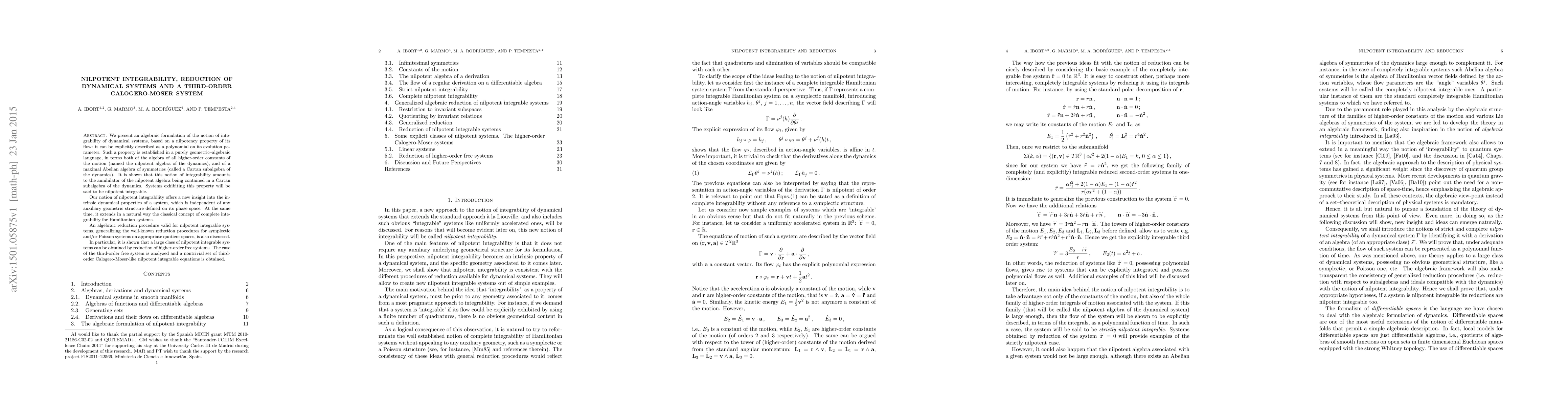 We present an algebraic formulation of the notion of integrability of dynamical systems, based on a nilpotency property of its flow: it can be explicitly described as a polynomial on its evolution parameter. Such a property is established in a purely geometric--algebraic language, in terms both of the algebra of all higher-order constants of the motion (named the nilpotent algebra of the dynamics), and of a maximal Abelian algebra of symmetries (called a Cartan subalgebra of the dynamics). It is shown that this notion of integrability amounts to the annihilator of the nilpotent algebra being contained in a Cartan subalgebra of the dynamics. Systems exhibiting this property will be said to be nilpotent integrable. Our notion of nilpotent integrability offers a new insight into the intrinsic dynamical properties of a system, which is independent of any auxiliary geometric structure defined on its phase space. At the same time, it extends in a natural way the classical concept of complete integrability for Hamiltonian systems. An algebraic reduction procedure valid for nilpotent integrable systems, generalizing the well-known reduction procedures for symplectic and/or Poisson systems on appropriate quotient spaces, is also discussed. In particular, it is shown that a large class of nilpotent integrable systems can be obtained by reduction of higher-order free systems. The case of the third-order free system is analyzed and a nontrivial set of third-order Calogero-Moser-like nilpotent integrable equations is obtained.