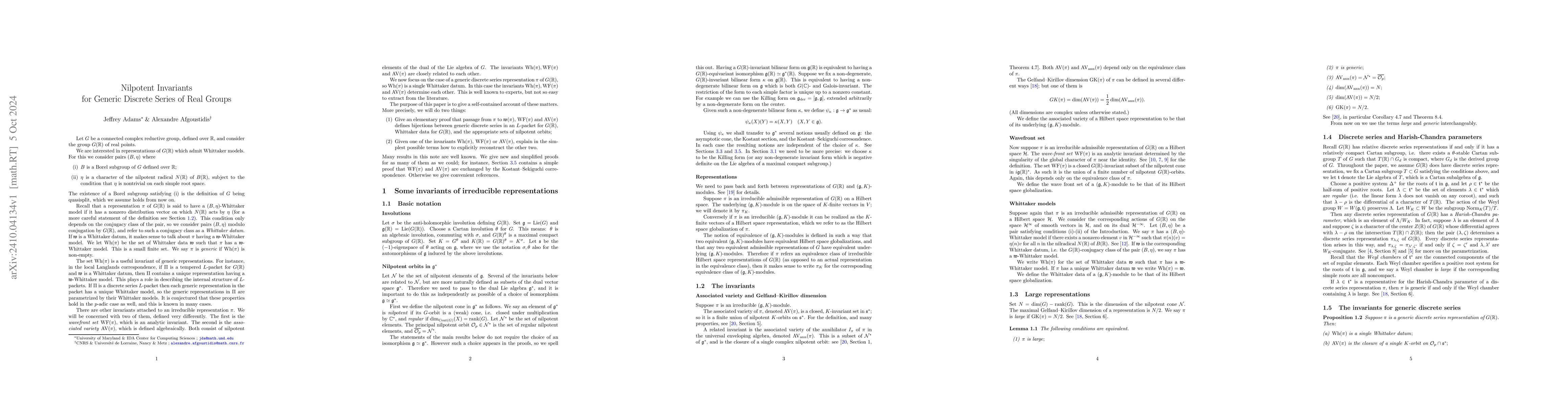 This paper explores nilpotent invariants for irreducible representations of real reductive groups with Whittaker models, showing that these invariants—associated variety, wave-front set, and Whittaker data—mutually determine each other for generic discrete series representations. It provides simplified proofs and reconstructs the invariants from any given one.