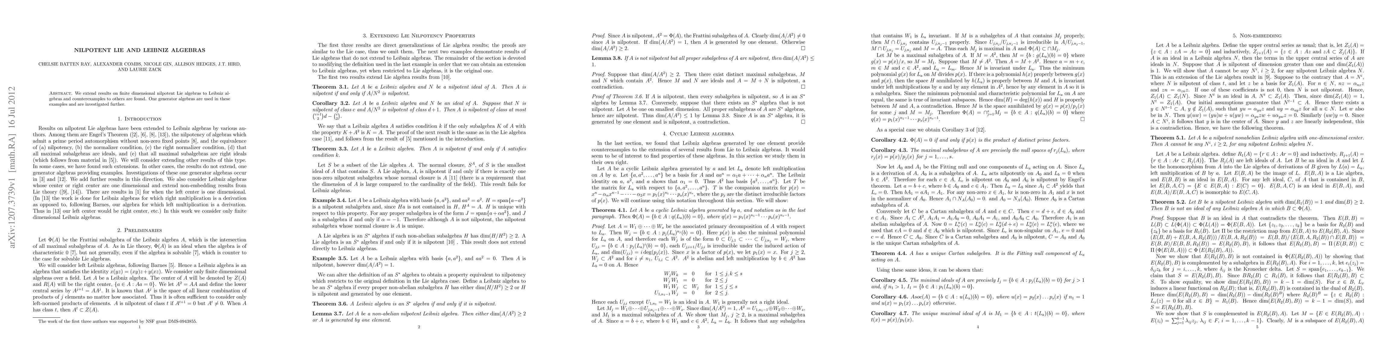 We extend results on finite dimensional nilpotent Lie algebras to Leibniz algebras and counterexamples to others are found. One generator algebras are used in these examples and are investigated further.